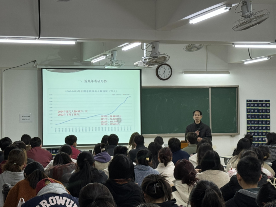 首先,谢教授结合近几年的考研数据,分析了当前英语专业的考研趋势,并指出考研对于英语专业学生未来发展的重要性,鼓励学生们要坚定信心,勇敢追求自己的梦想。
