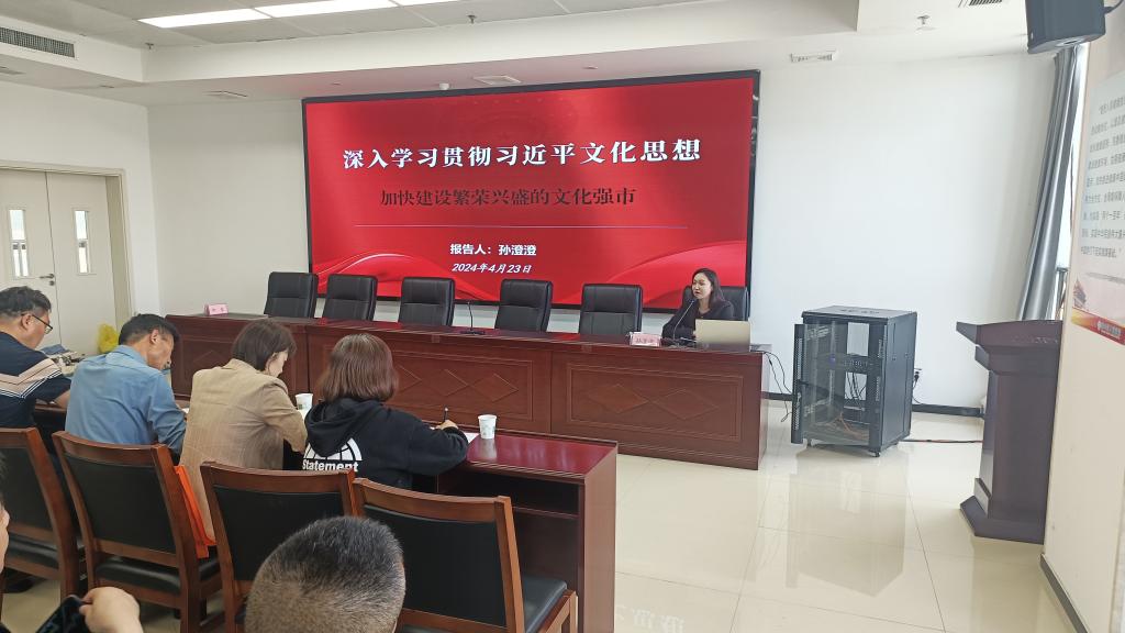 4月23日下午,淮北市相山区卫生健康系统“举旗帜·送理论”学习贯彻习近平文化思想宣讲报告会在相山区人民医院召开。马克思主义学院孙澄澄作为淮北市委宣讲团成员,受邀作题为《深入学习贯彻习近平文化思想·加快建设繁荣兴盛的文化强市》的宣讲报告。相山区卫生健康委班子成员全体参会,相山区卫生健康委党委书记柳泰主持会议。