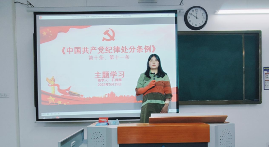 本次党课党支部书记石园园继续为大家解读第十章和第十一章的内容,详细讲述结束后,对《中国共产党廉洁自律准则》和《中国共产党问责条例》进行领学。会上党支部书记石园园强调,全体党员要坚持把纪律和规矩放在最前面,做到知纪、明纪、敬纪、守纪,深刻理解把握党纪学习教育的任务、目标和意义。