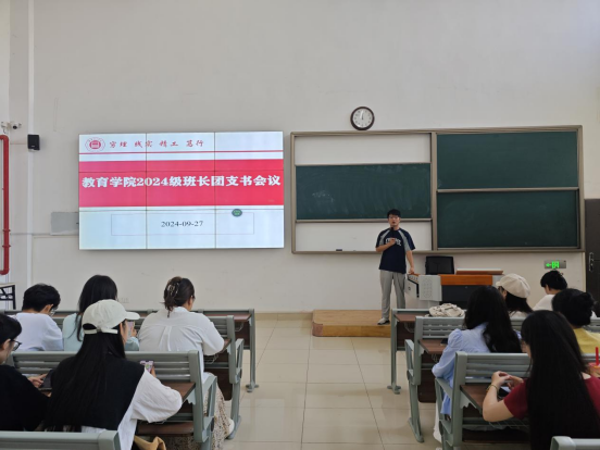 为提高班长和团支书的组织管理能力,发挥优秀学生干部的带头作用,促进学院工作有序开展。9月27日中午12时,教育学院在一号教学楼121教室组织召开2024级学生班长、团支书会仪。本次会议由教育学院团总支书记许海涛主持,2024级全体新生辅导员以及2024级全体班长、团支书参会。