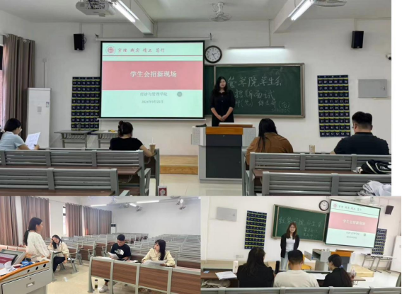 2024年9月25日下午,经济与管理学院在二教415、416、417教室成功举办了一场别开生面的学生会招新面试活动,旨在为学生会注入新鲜活力,优化组织结构,并提升整体干部队伍的素质与能力。评委由书记助理叶赵强、团总支书记员禹辛及辅导员王绎程、张雨停、刘子恢、石园园、徐瑞鲜、郑凡、焦乙皓、韩心影和李慧娴组成。本次招新分三组进行,通过自我推介和考核答辩的方式对竟参同学进行选拔。