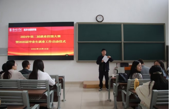 为进一步增强我院学生的就业竞争力,提升职业素养与实践能力,促进理论知识与就业市场的深度融合,经济与管理学院于10月16日下午在一教121开展“第二届就业技能大赛暨2025届毕业生就业工作、校企合作月启动仪式”。学院党总支书记、院长吴玲,书记助理叶赵强,各专业教研室主任、毕业班辅导员以及全体2025届600多名毕业生参加本次活动,处长助理李魏代表学生处(就业处)参加了启动仪式。本次活动分两场分别由郑凡和范红玲主持。