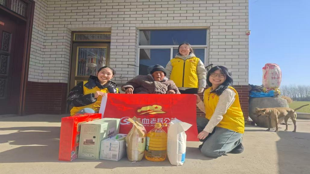 与此同时,2024级数据科学与大数据技术的赵新衍同学则在家乡安徽省阜阳市开展了“助老助困探望老兵”志愿服务活动。她和志愿者们赴近百公里外的颍州区九龙镇慰问百岁老兵姚连德,聆听他的军旅故事,感受他的家国情怀。志愿者们还为老兵送上了精心准备的慰问品,“老兵的故事让我们深刻理解了什么是责任与担当,什么是家国情怀。我们要把他们的精神传承下去,为实现中华民族伟大复兴贡献自己的力量。”赵新衍同学说道。