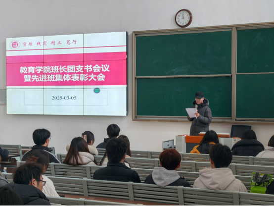 为促进班级管理交流,增强各班学生干部工作能力和激励全院班级努力营造良好班集体氛围。3月5日中午,教育学院在一号教学楼121教室开展了“班长、团支书会议暨先进班集体表彰大会”。会议由学院团总支副书记许海涛主持,分管副书记孟向红、书记助理黄莹莹、24级全体辅导员以及各班班长、团支书参加了会议。