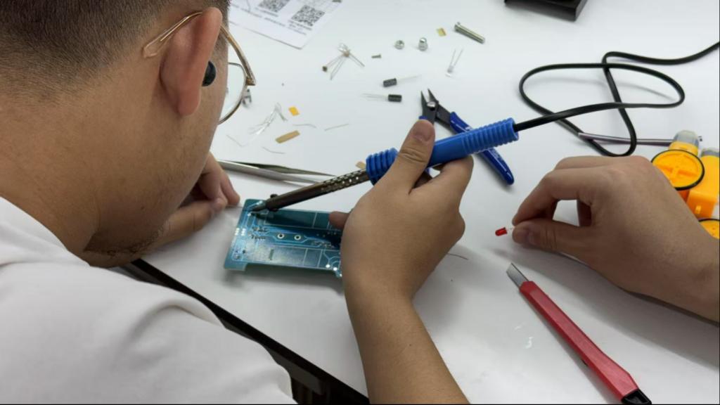随后,学生们进入循迹小车制作环节。活动采用红色LED作为光源,光线通过地面反射到光敏电阻上,通过检测光敏电阻的阻值变化,判断小车是否行驶在白色区域。经过一个多小时的努力,一辆辆精巧的循迹小车在学生们手中诞生。