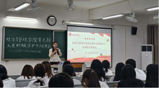 为进一步加强入党积极分子的培养教育,提高入党积极分子的政治素养和理论水平,5月16日晚,经济与管理学院在一教421教室隆重举行第七期入党积极分子培训班开班典礼。学院党总支组织员王胜男、管理学学生支部书记石园园以及本期89名入党积极分子共同参与,开班典礼由张雨停主持。