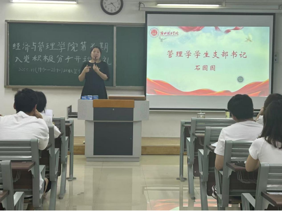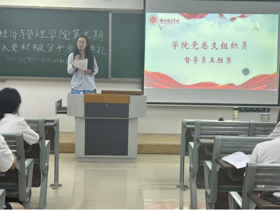 典礼伊始,管理学学生支部书记石园园发表讲话。她详细解读了《淮北理工学院第七期入党积极分子培训班学员手册》,重点强调课程内容和时间安排,指出本次培训是入党积极分子系统学习党的理论知识、端正入党动机、提升党性修养的重要契机。石书记还对全体学员提出了明确要求,希望学员们珍惜此次学习机会,严格遵守培训纪律并完成相关学习要求(包括学习强国的学习,心得体会撰写等),认真学习党的章程、党的历史和党的基本理论,努力做到学有所思、学有所悟、学有所得,以实际行动向党组织靠拢。