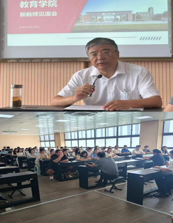 会议上,王家云院长在介绍学院基本情况时指出,教育学院作为学校最早设立的三个二级教学单位之一,设有4个本科专业和1个体育教学部,横跨文学、教育学、理学等3个学科,是可实现多学科交流互鉴的学院。学院青年教师占比高达90%,是一支充满活力、未来可期的队伍。他希望新入职教师牢记立德树人根本任务,尽快熟悉课程、严守课堂纪律、上好每一堂课;尽快融入团队,参与专业建设。王院长特别强调,学生培养是“共同体”事业,希望新教师能以自身经历引导学生发展,用真心真情助力学生成长,成为学生求学路上可靠的引路人。