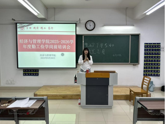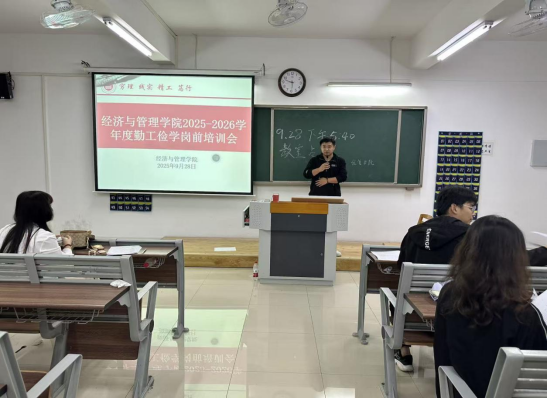 为规范勤工助学岗位管理,帮助学生更好地适应工作角色,经济与管理学院于9月28日在二教422召开2025-2026学年勤工助学岗前培训会,学院书记助理员禹辛、实验室主任、教学秘书李健、负责勤工助学工作的老师以及66名已录用学生共同参加,会议由院学生会文体部部长汪朱仝主持。