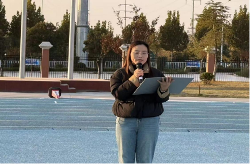 2025年11月10日,学生代表孙莹以《以今日之我,筑明日之中国》为主题进行国旗下演讲。今日之中国,是前辈们奋斗的硕果;明日之中国,待我们续写华章。作为新时代青年,我们当以理想为帆、实干为桨,在学习中锤炼本领,在实践中增长才干。不必仰望远方,脚下即是征途。让我们把青春热血融入国家发展,用每一次拼搏、每一份坚守,汇聚成强国建设的磅礴力量,以今日之我,筑就明日更加繁荣昌盛的中国。