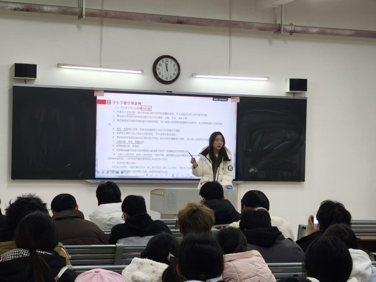 各班级班会通过多种形式,深入学习《淮北理工学院全日制普通本科学生学籍管理细则》、《淮北理工学院学生违纪处分办法》等相关规章制度,明确考试违规行为的认定标准和相应处分措施,包括考试违纪、考试作弊等,让学生意识到考试作弊带来的严重后果:一次作弊行为,不仅会导致课程成绩无效,受到纪律处分,更会在个人档案中留下无法抹去的污点,影响未来的升学、就业乃至人生发展。