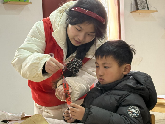 掌握基础后,课程进入核心环节——学写“福”字。志愿者将“福”字拆解为“示”字旁与“畐”,在米字格黑板上一笔一画放大演示,详细讲解起笔、行笔与收笔的要领。“左边的点要轻灵落下,右边的横折要坚定有力,最后的‘田’字要写得方正饱满,就像我们做人做事,要稳重要扎实。”孩子们听得聚精会神,随后在志愿者的指导下,屏息凝神,在红纸上学着运腕书写。从最初线条的颤抖生涩,到渐渐能写出像样的笔画,成就感在教室里悄然弥漫。“老师,我好像握住笔了!”“我的‘福’字站起来了!”孩子们举着自己的作品,兴奋地交流着。