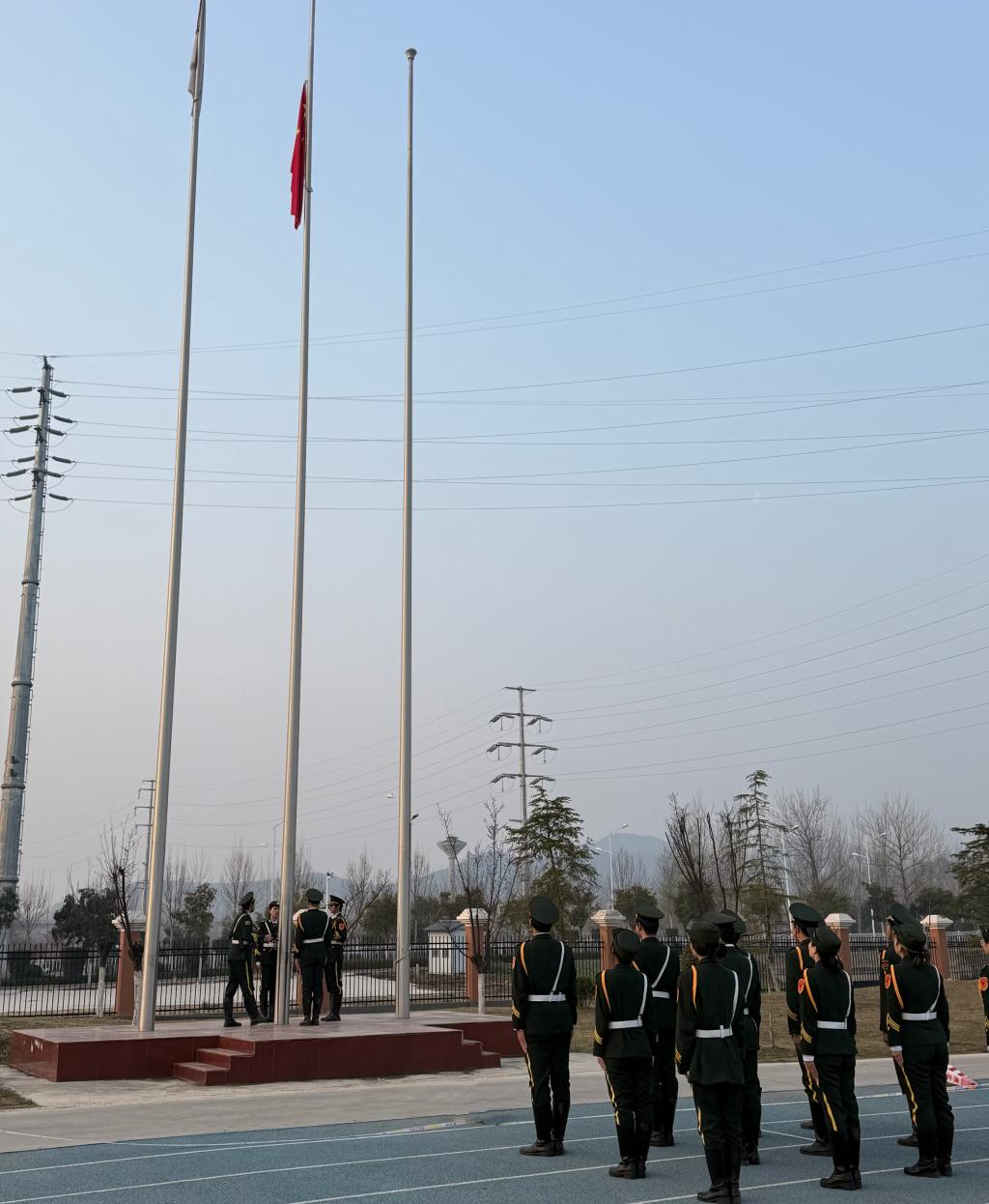 伴随着激昂的旋律,升旗仪式正式拉开帷幕。全体师生齐聚国旗下,面向国旗肃立致敬,在雄壮的国歌声中,五星红旗冉冉升起,大家行注目礼、齐唱国歌,以庄严的仪式感传递对廉洁精神的尊崇与追求。