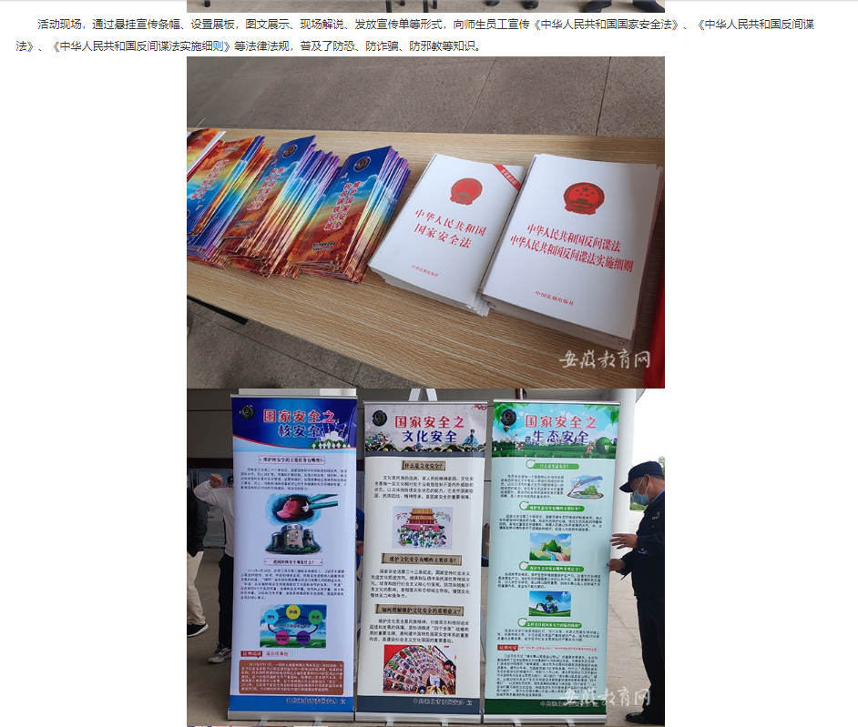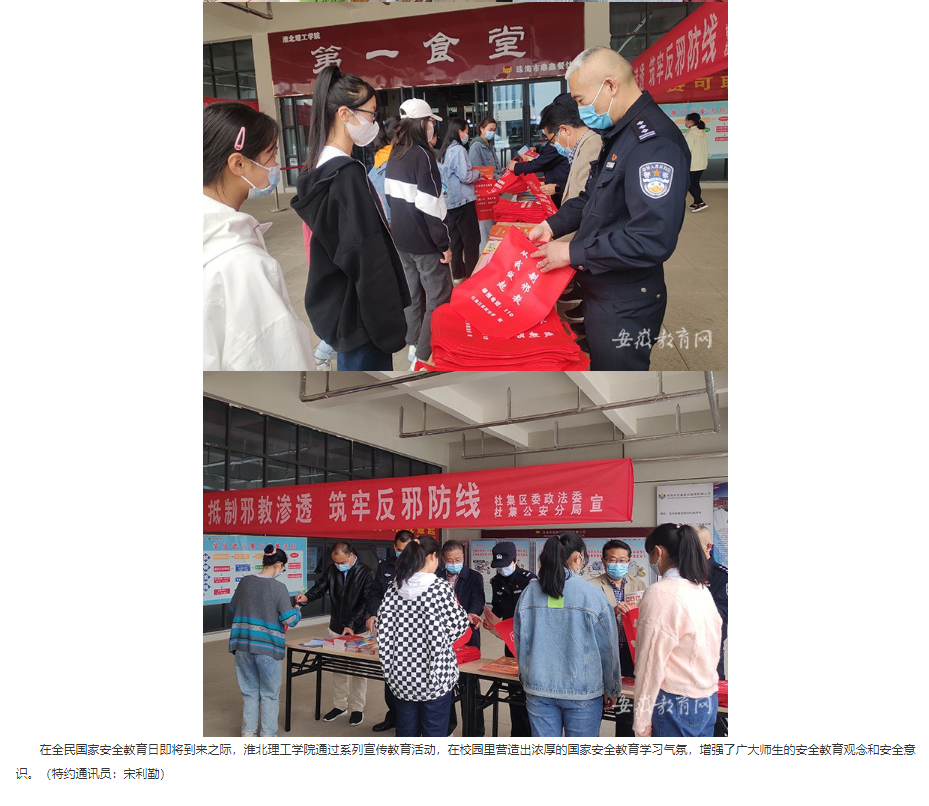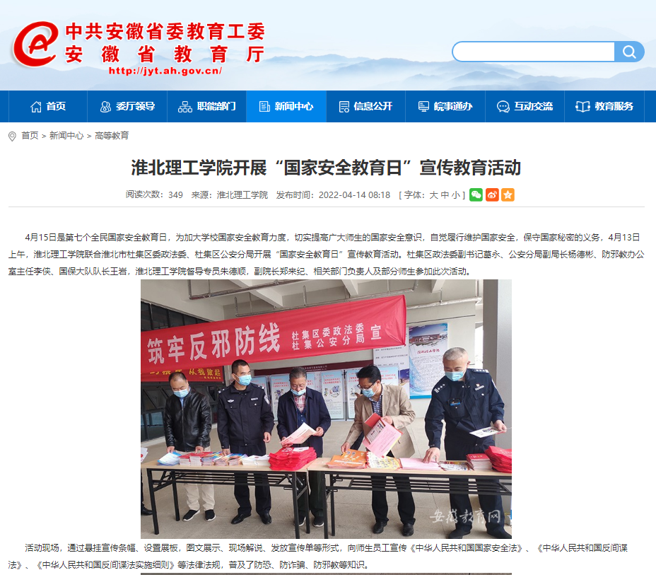 4月15日是第七个全民国家安全教育日,为加大学校国家安全教育力度,切实提高广大师生的国家安全意识,自觉履行维护国家安全,保守国家秘密的义务,4月13日上午,淮北理工学院联合淮北市杜集区委政法委、杜集区公安分局开展“国家安全教育日”宣传教育活动。安徽教育网在首页进行了报道。
