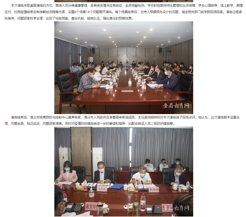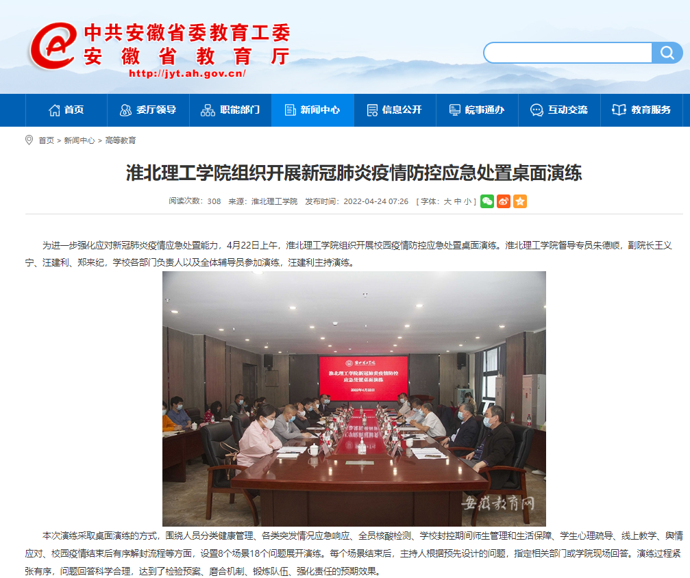 为进一步强化应对新冠肺炎疫情应急处置能力,4月22日上午,淮北理工学院组织开展校园疫情防控应急处置桌面演练。安徽教育网首页对此进行了报道。
