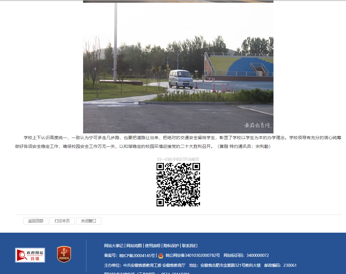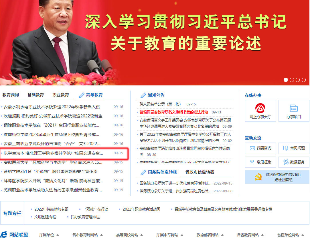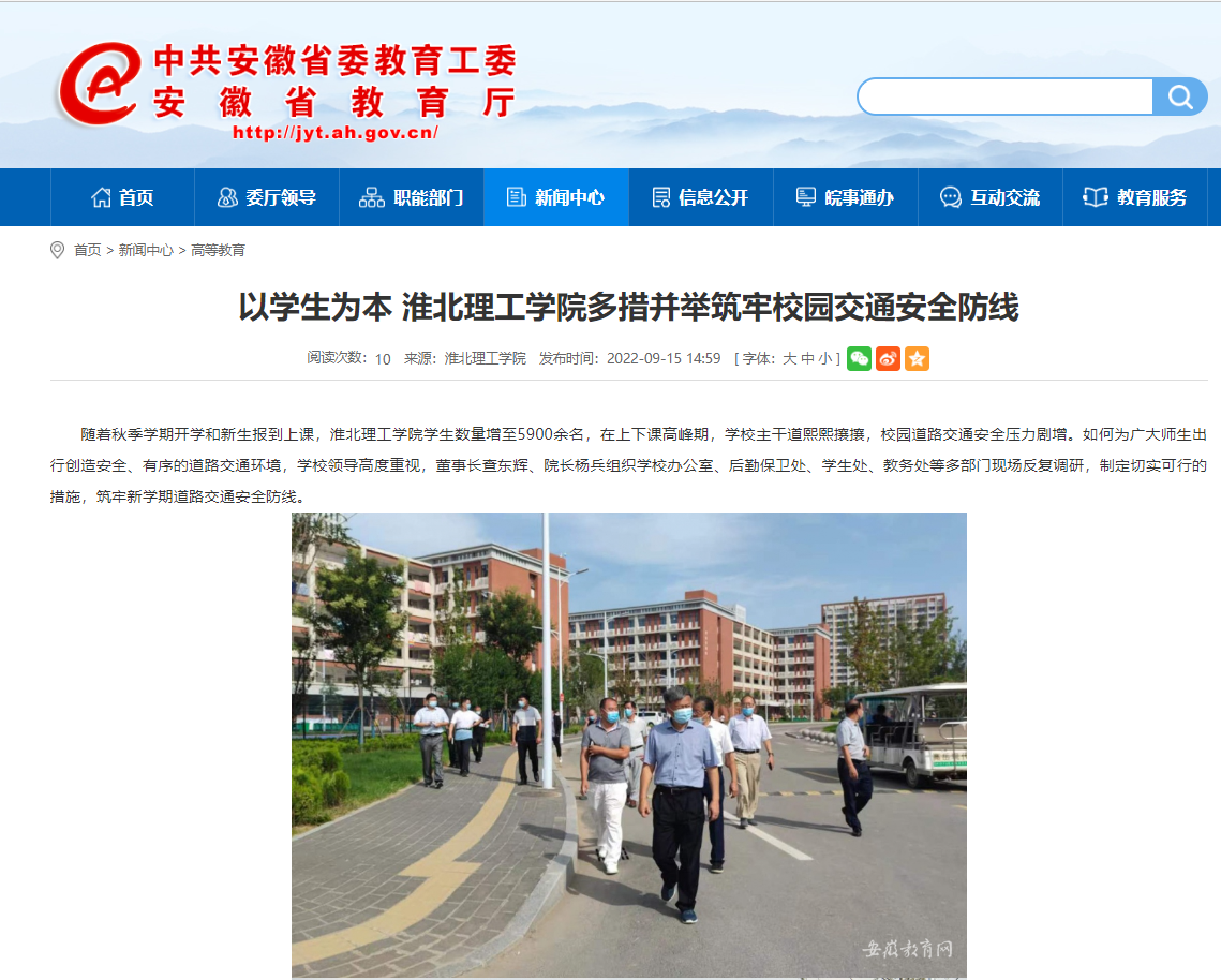 如何为广大师生出行创造安全、有序的道路交通环境。学校领导高度重视,董事长查东辉、校长杨兵组织校长办公室、后勤保卫处、学生处、教务处等多部门亲临现场反复调研,制定切实可行的措施,筑牢新学期道路交通安全防线。安徽教育网首页对此进行了报道。