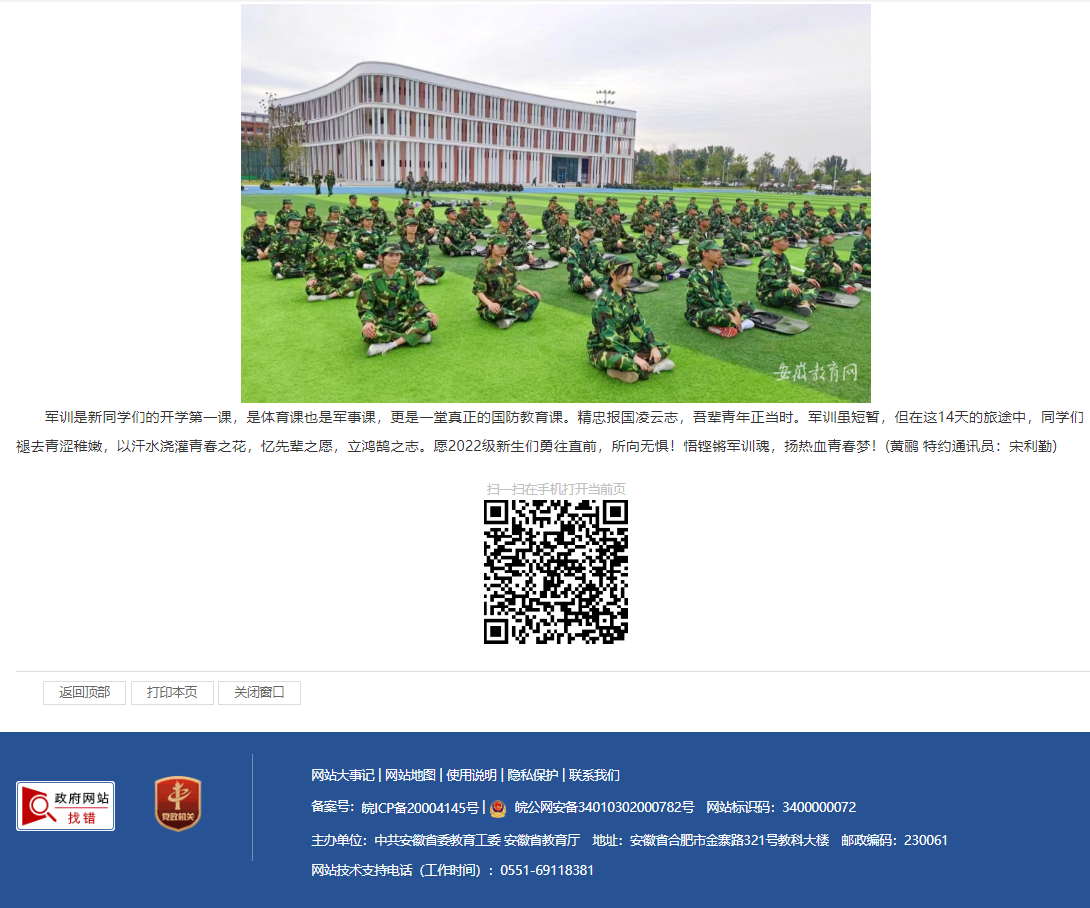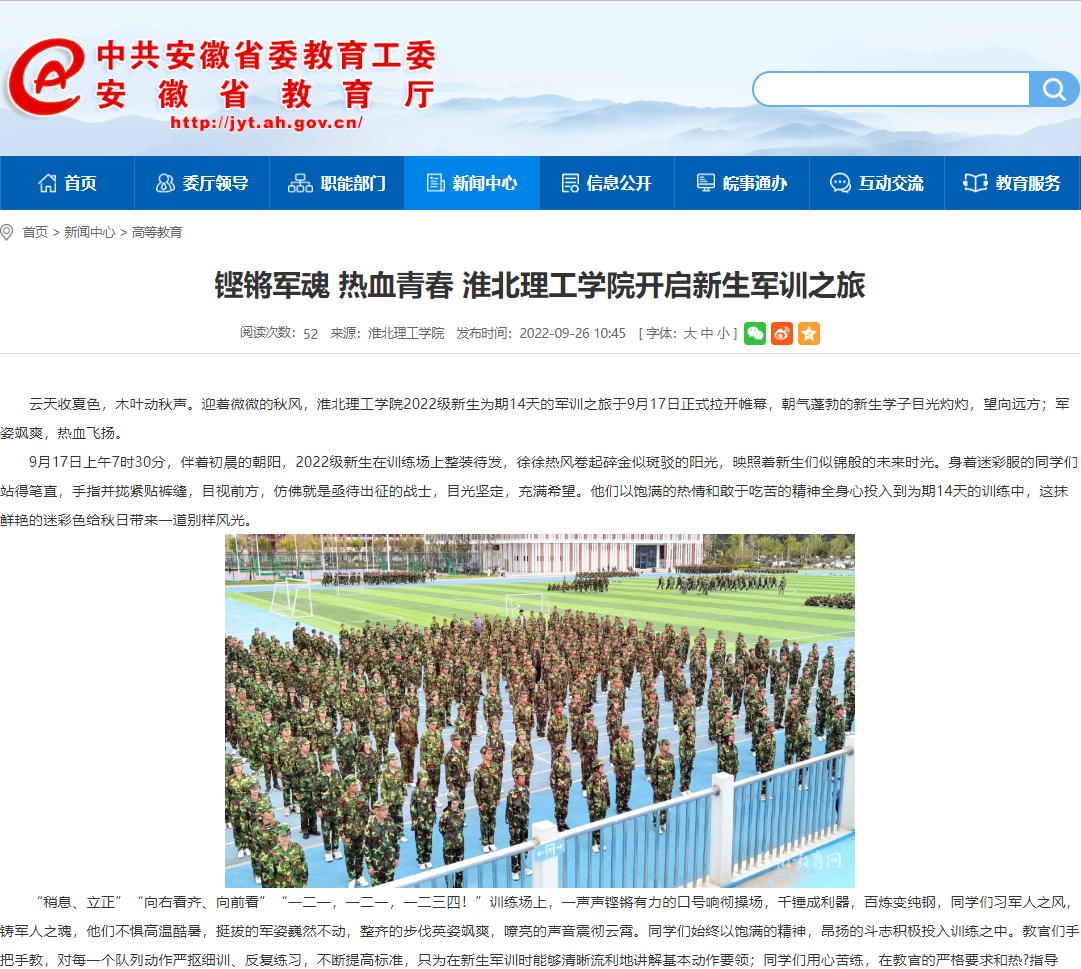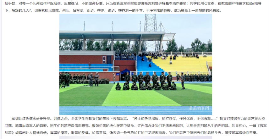 我校2022级新生为期14天的军训之旅于9月17日正式拉开帷幕,朝气蓬勃的新生学子目光灼灼,望向远方;军姿飒爽,热血飞扬。安徽教育网对此进行了报道。
