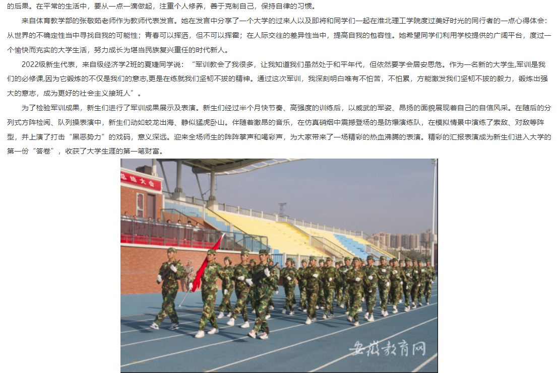 秋日暖阳,金桂飘香。9月30日,淮北理工学院在运动场隆重举行2022级新生开学典礼暨军训总结大会。安徽教育网首页对此进行了报道。