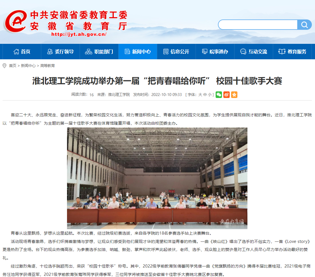 为繁荣校园文化生活,努力营造积极向上、青春活力的校园文化氛围,为学生提供展现自我才能的舞台。淮北理工学院以“把青春唱给你听”为主题的第一届十佳歌手大赛在体育馆隆重开唱。安徽教育网对此进行了报道。