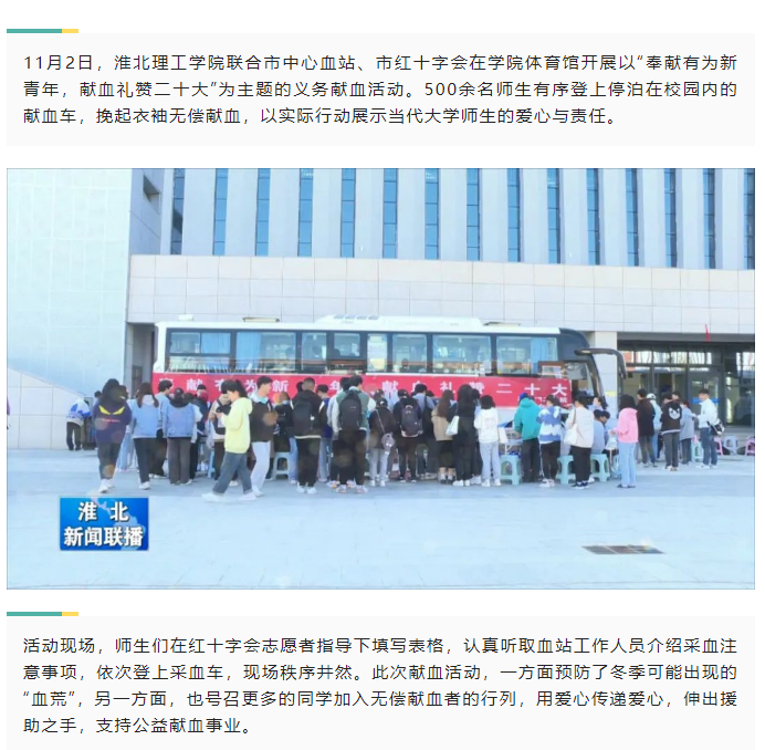 11月2日,淮北理工学院于体育馆门口开展“青春热血,传递温情”无偿献血活动,淮北新闻联播对此进行了报道。