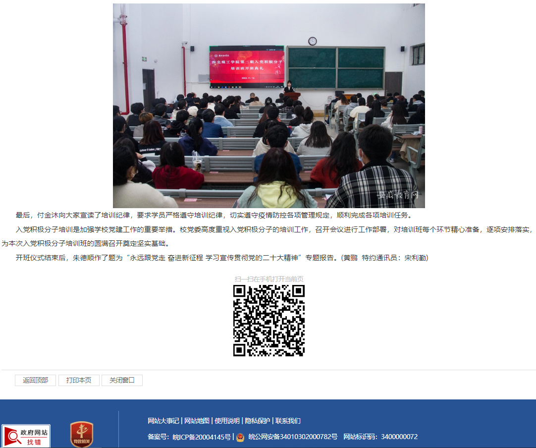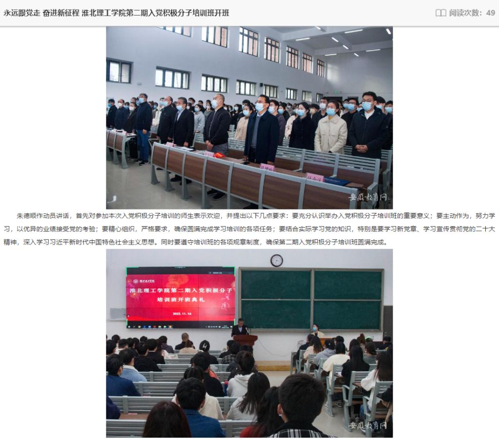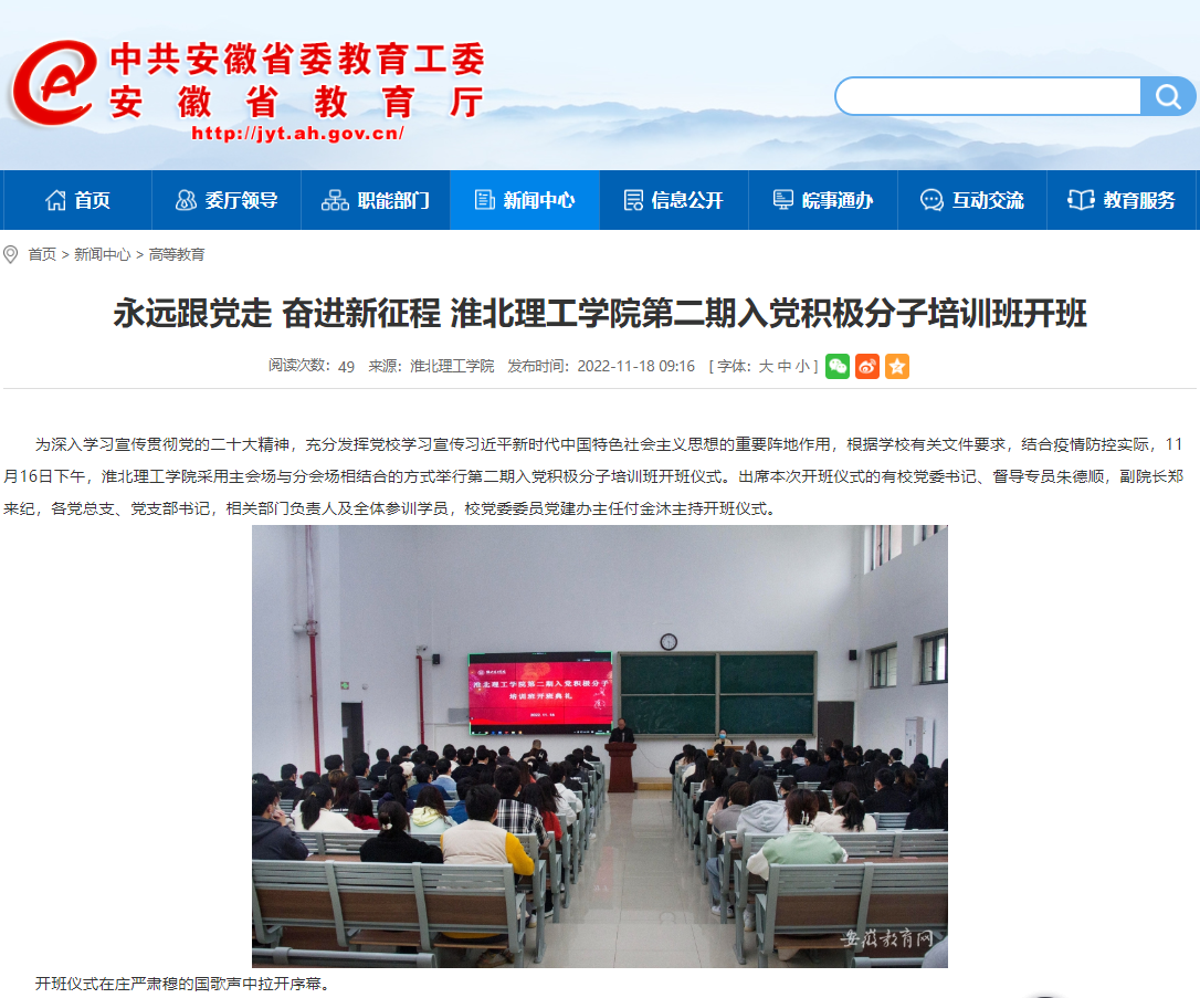 11月16日下午,淮北理工学院采用主会场与分会场相结合的方式举行第二期入党积极分子培训班开班仪式。出席本次开班仪式的有校党委书记、督导专员朱德顺,副院长郑来纪,各党总支、党支部书记,相关部门负责人及全体参训学员,校党委委员党建办主任付金沐主持开班仪式。安徽教育网对此进行了报道。