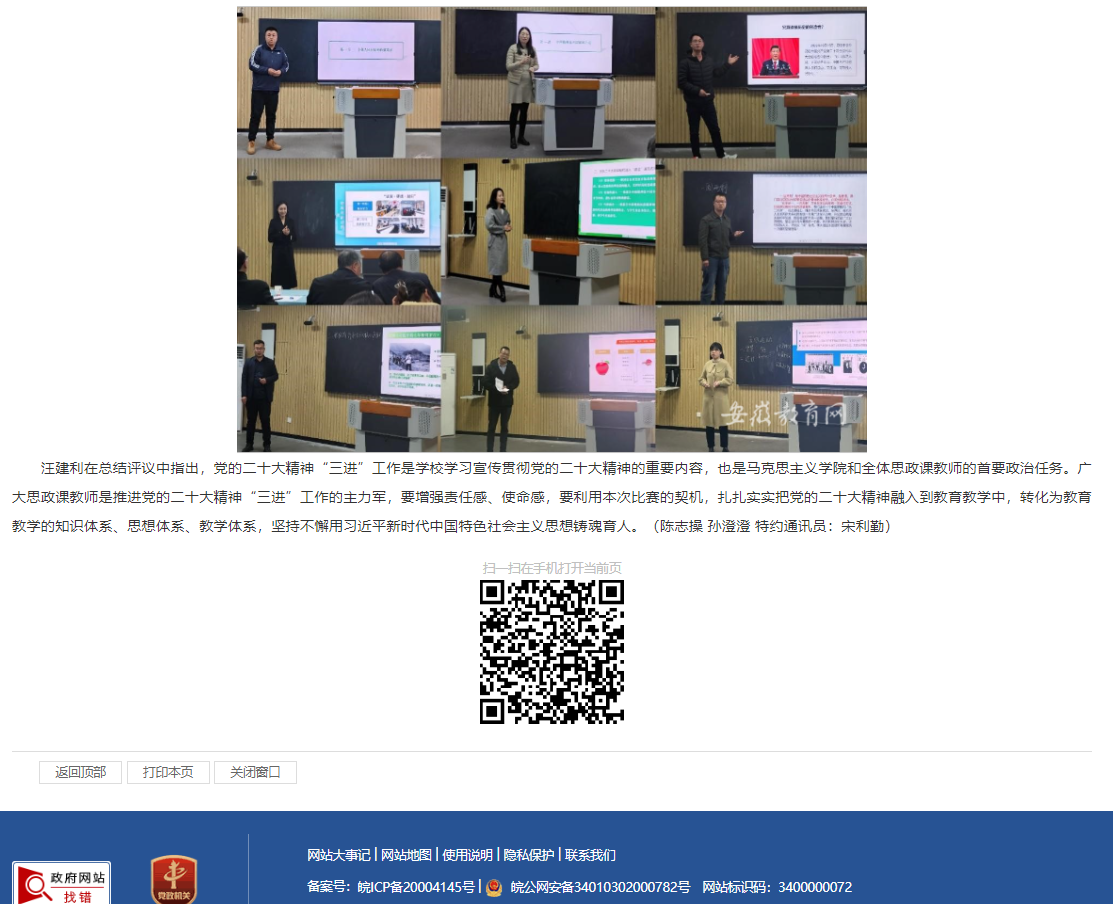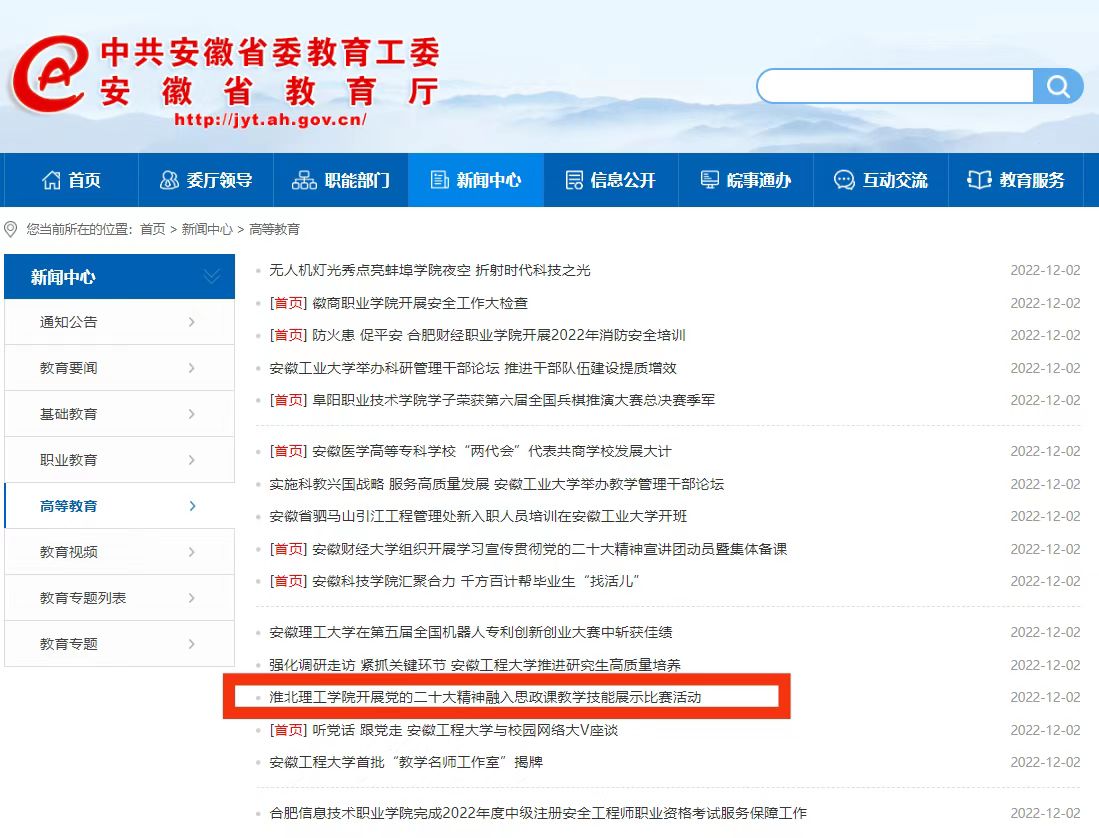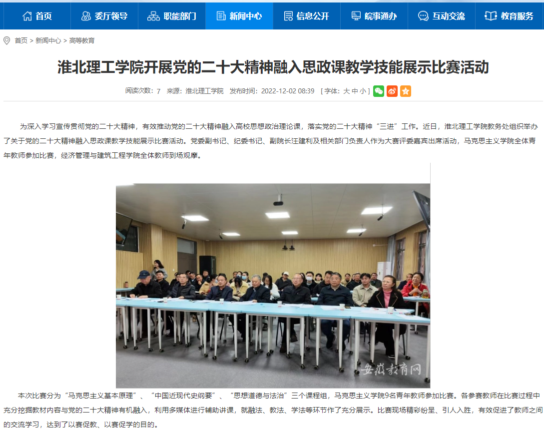 为深入学习宣传贯彻党的二十大精神,有效推动党的二十大精神融入高校思想政治理论课,落实党的二十大精神“三进”工作。近日,淮北理工学院教务处组织举办了关于党的二十大精神融入思政课教学技能展示比赛活动。安徽教育网对此进行了报道。