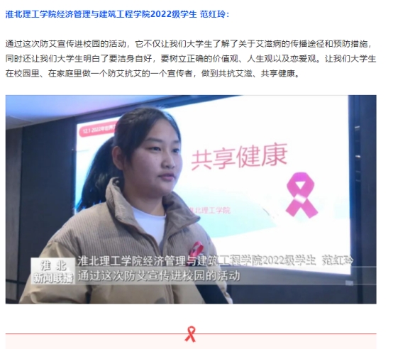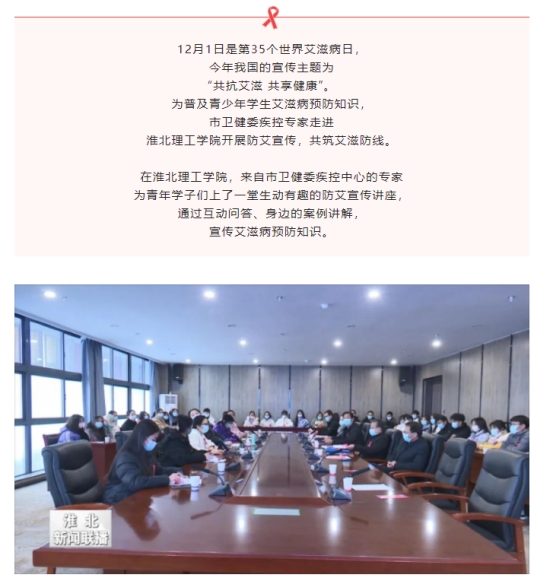 12月1日为“世界艾滋病日”。为宣传艾滋病防控知识,帮助学生掌握防艾常识,树立正确的健康生活理念,提高自我保护意识。2022年11月30日下午,淮北市卫生健康委员会、淮北市疾控中心领导及专家莅临淮北理工学院开展了以“共抗艾滋共享健康”为主题的预防艾滋病宣传教育活动。淮北新闻联播对此进行了报道。