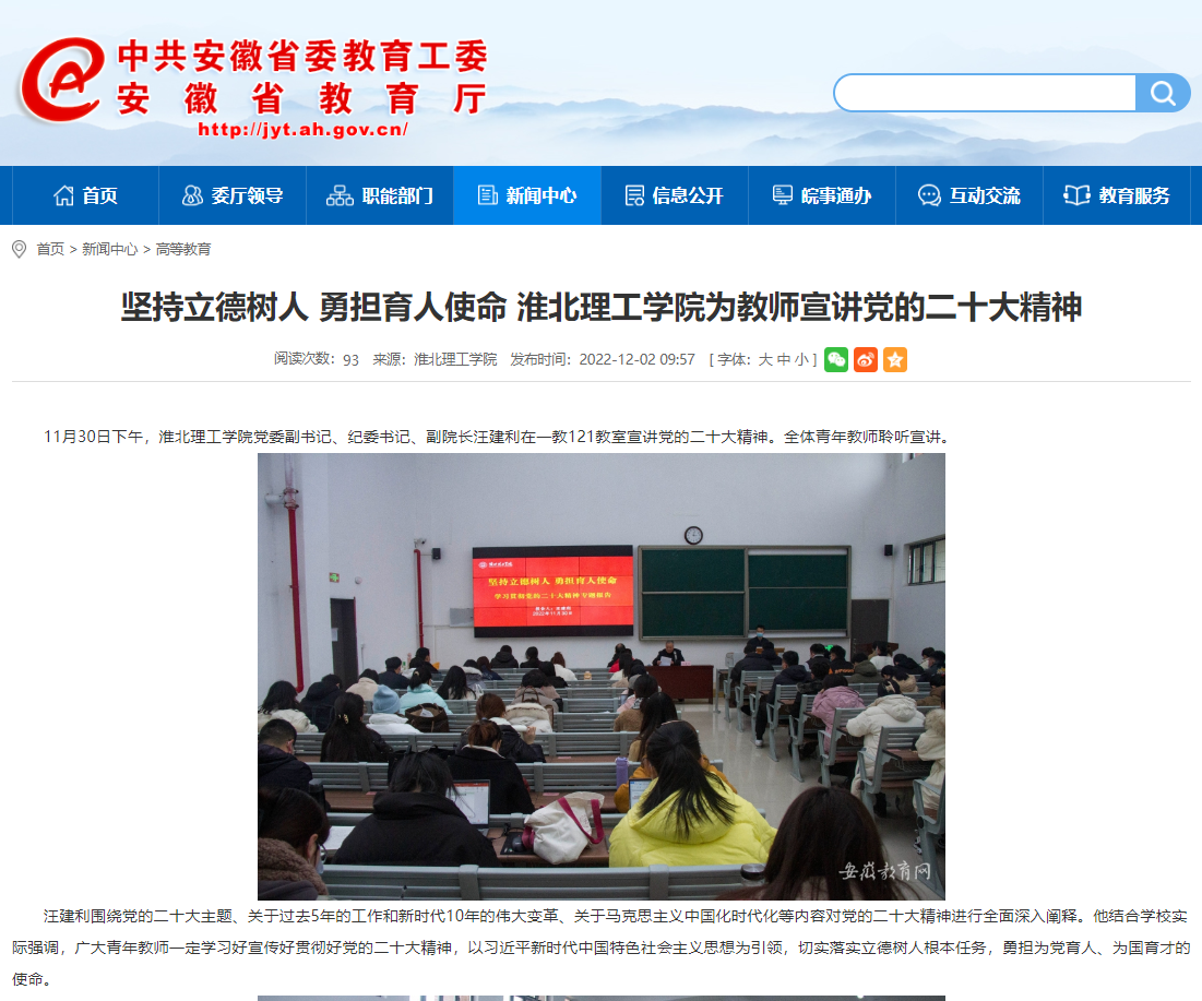 11月30日下午,淮北理工学院党委副书记、纪委书记、副院长汪建利在一教121教室宣讲党的二十大精神。全体青年教师聆听宣讲。安徽教育网对此进行了报道。