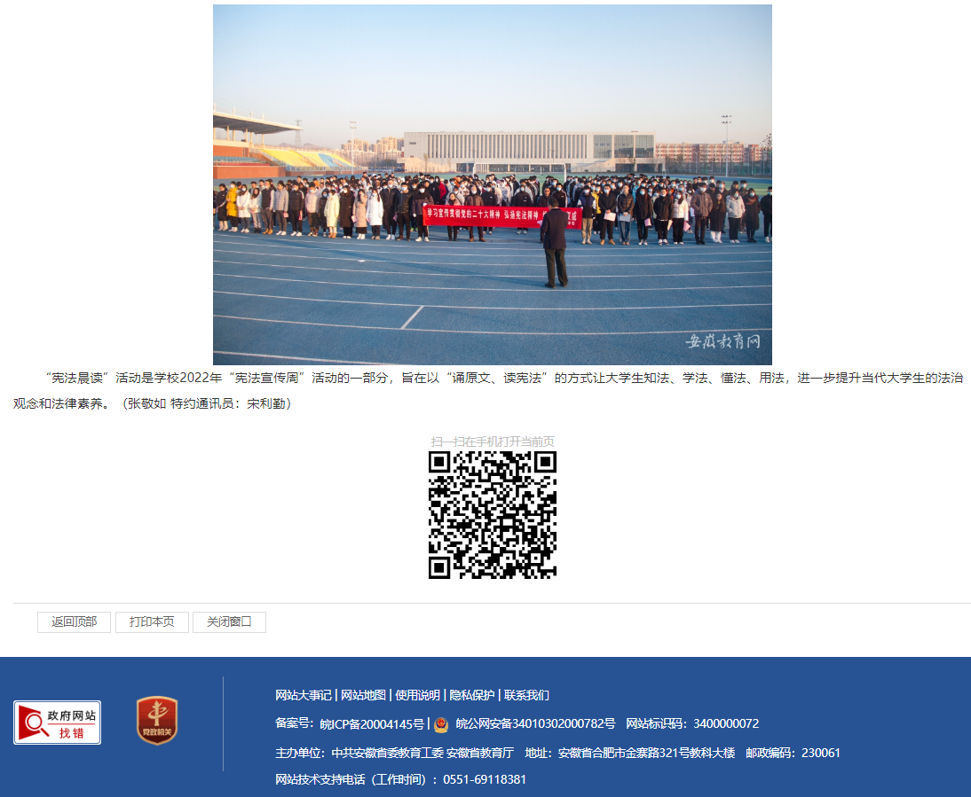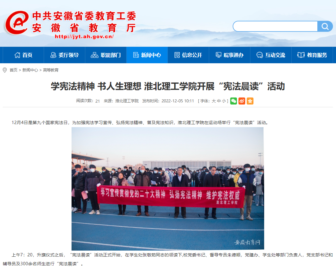 12月4日是第九个国家宪法日,为加强宪法学习宣传、弘扬宪法精神、普及宪法知识,淮北理工学院在运动场举行“宪法晨读”活动。安徽教育网对此进行了报道。