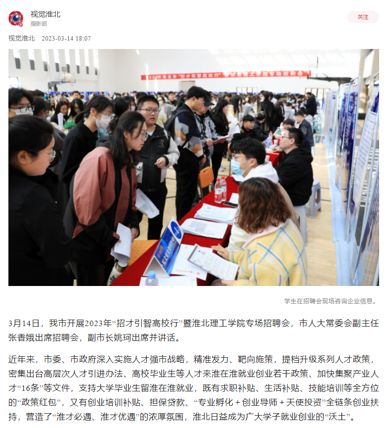 为深入贯彻党中央、国务院和省委、省政府“稳就业”“保就业”决策部署,积极做好高校毕业生就业工作,抓住高校毕业生春招“黄金期”,搭建用人单位与高校毕业生充分洽谈交流平台,积极为淮北市发展输送应用型人才,3月14日上午,“淮有梦想 智引未来”--2023年淮北市“招才引智高校行”招聘活动在学校成功举办。视觉淮北对此进行了报道。