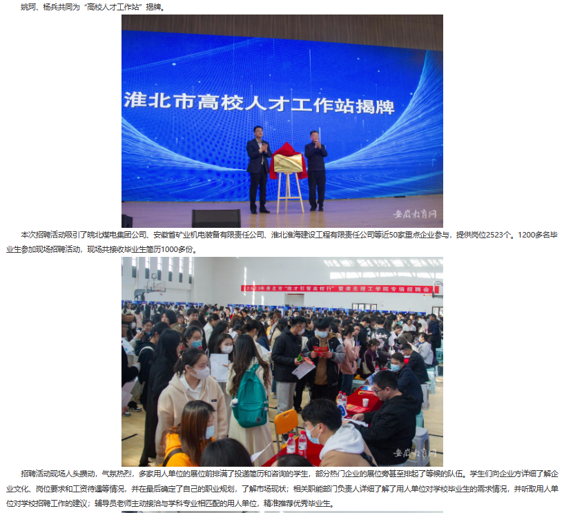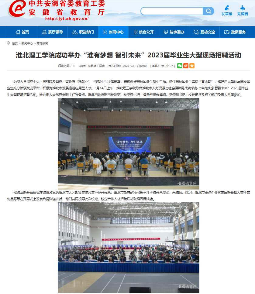 为深入贯彻党中央、国务院及省委、省政府“稳就业”“保就业”决策部署,积极做好高校毕业生就业工作,抓住高校毕业生春招“黄金期”,搭建用人单位与高校毕业生充分洽谈交流平台,积极为淮北市发展输送应用型人才。3月14日上午,淮北理工学院联合淮北市人力资源与社会保障局成功举办“淮有梦想 智引未来”2023届毕业生大型现场招聘活动。安徽教育网首页对此进行了报道。