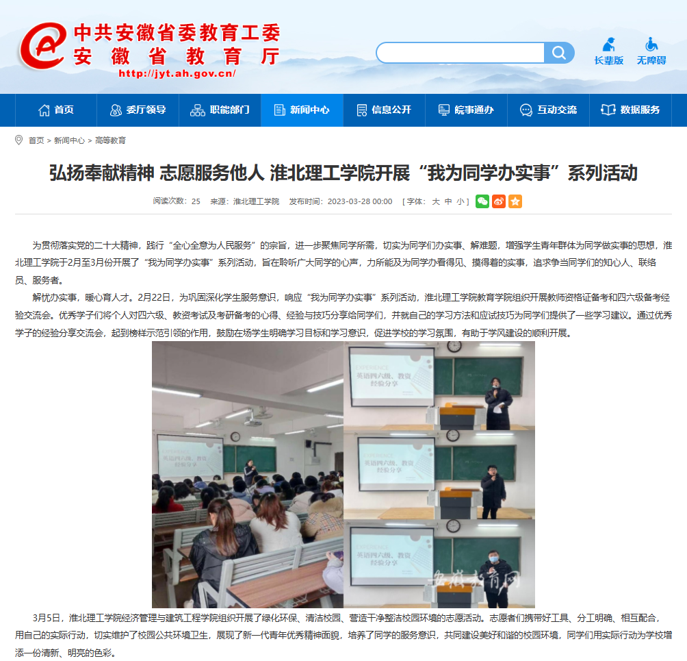 为贯彻落实党的二十大精神,践行“全心全意为人民服务”的宗旨,进一步聚焦同学所需,切实为同学们办实事、解难题,增强学生青年群体为同学做实事的思想,淮北理工学院于2月至3月份开展了“我为同学办实事”系列活动,安徽教育网对此进行了报道。