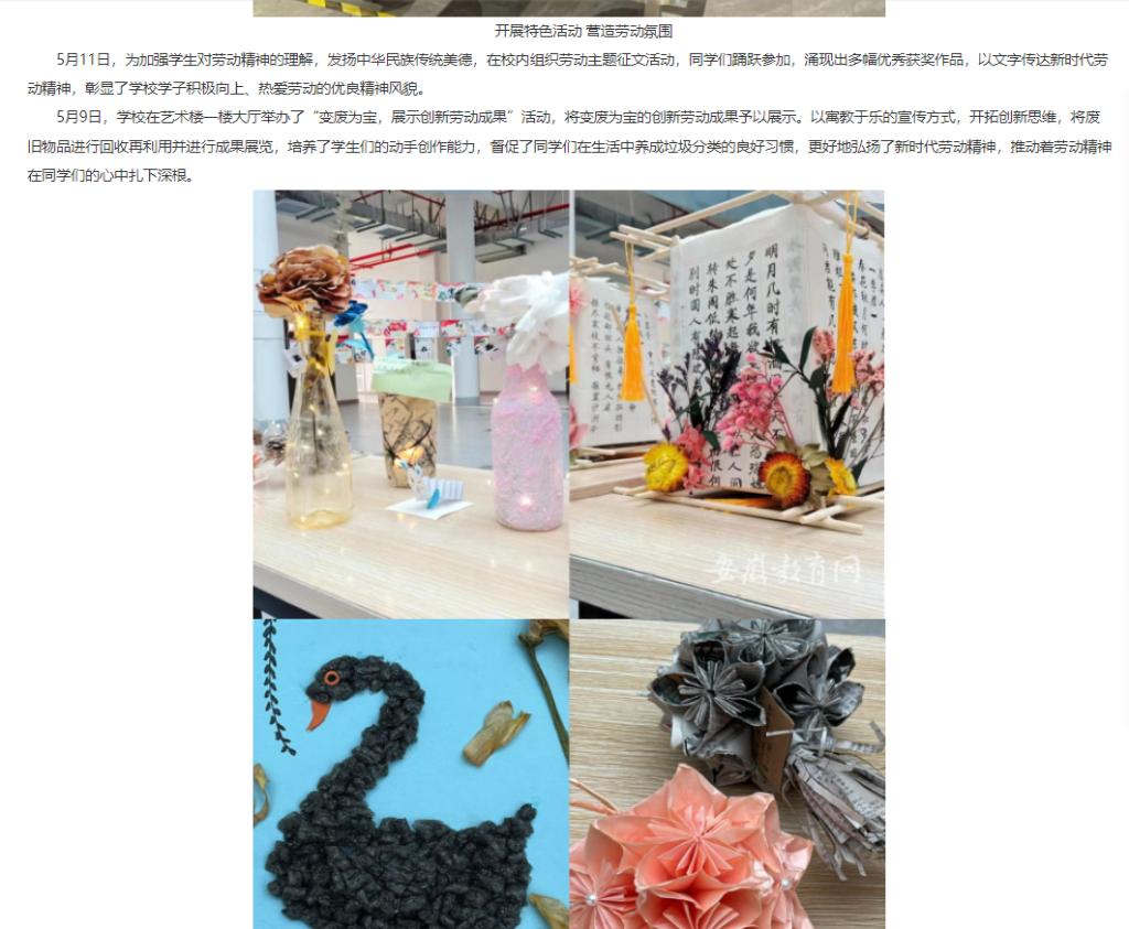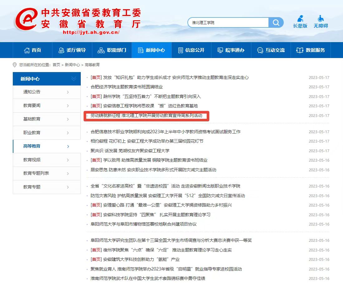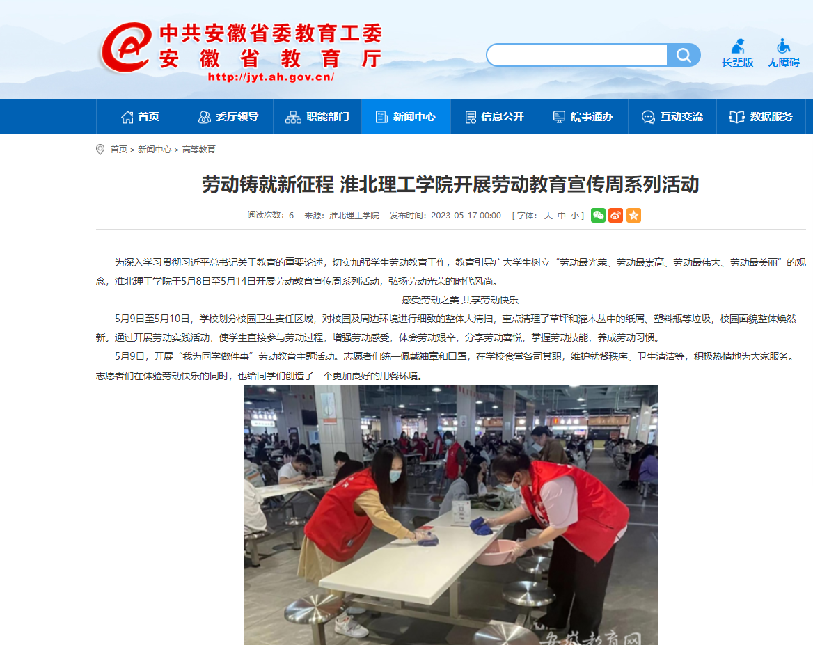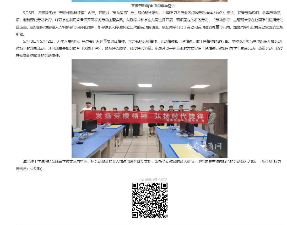 为深入学习贯彻习近平总书记关于教育的重要论述,切实加强学生劳动教育工作,教育引导广大学生树立“劳动最光荣、劳动最崇高、劳动最伟大、劳动最美丽”的观念,淮北理工学院于5月8日至5月14日开展劳动教育宣传周系列活动,弘扬劳动光荣的时代风尚。对此,安徽教育网作了报道: