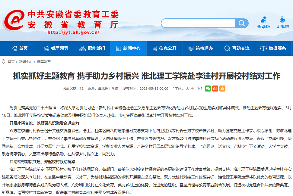 为贯彻落实党的二十大精神,将深入学习贯彻习近平新时代中国特色社会主义思想主题教育转化为助力乡村振兴的生动实践和具体成效,推动主题教育走深走实,5月18日,淮北理工学院校党委书记朱德顺及相关职能部门负责人赴淮北市杜集区高岳街道李洼村开展校村结对工作。安徽教育网对此进行了报道。