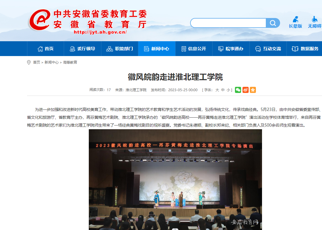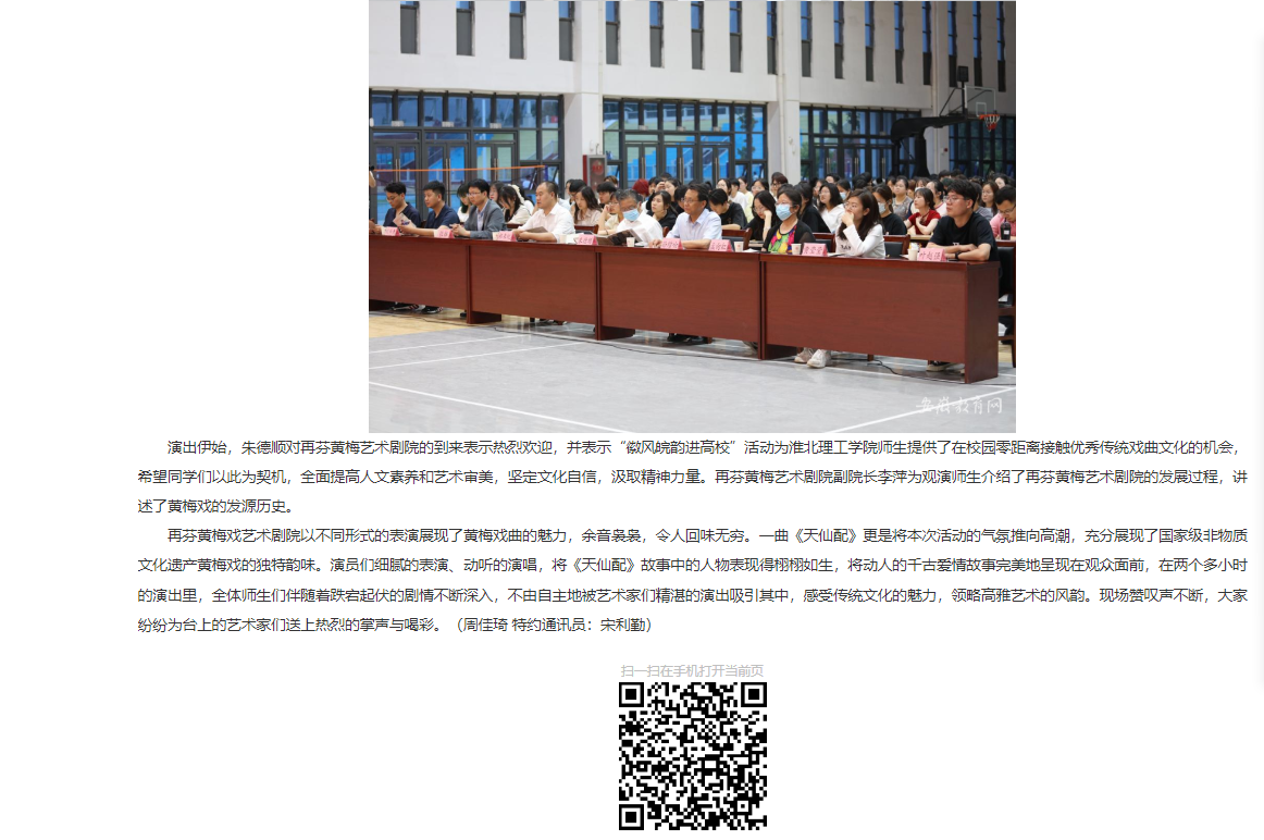 为进一步加强和改进新时代高校美育工作,带动淮北理工学院的艺术教育和学生艺术活动的发展,弘扬传统文化,传承戏曲经典。5月23日,由中共安徽省委宣传部、省文化和旅游厅、省教育厅主办,再芬黄梅艺术剧院、淮北理工学院承办的“徽风皖韵进高校——再芬黄梅走进淮北理工学院”演出活动在学校体育馆举行,来自再芬黄梅艺术剧院的艺术家们为淮北理工学院师生带来了一场经典黄梅戏剧目的视听盛宴。党委书记朱德顺、副校长郑来纪、相关部门负责人及500余名师生观看演出。对此,安徽教育网进行了报道: