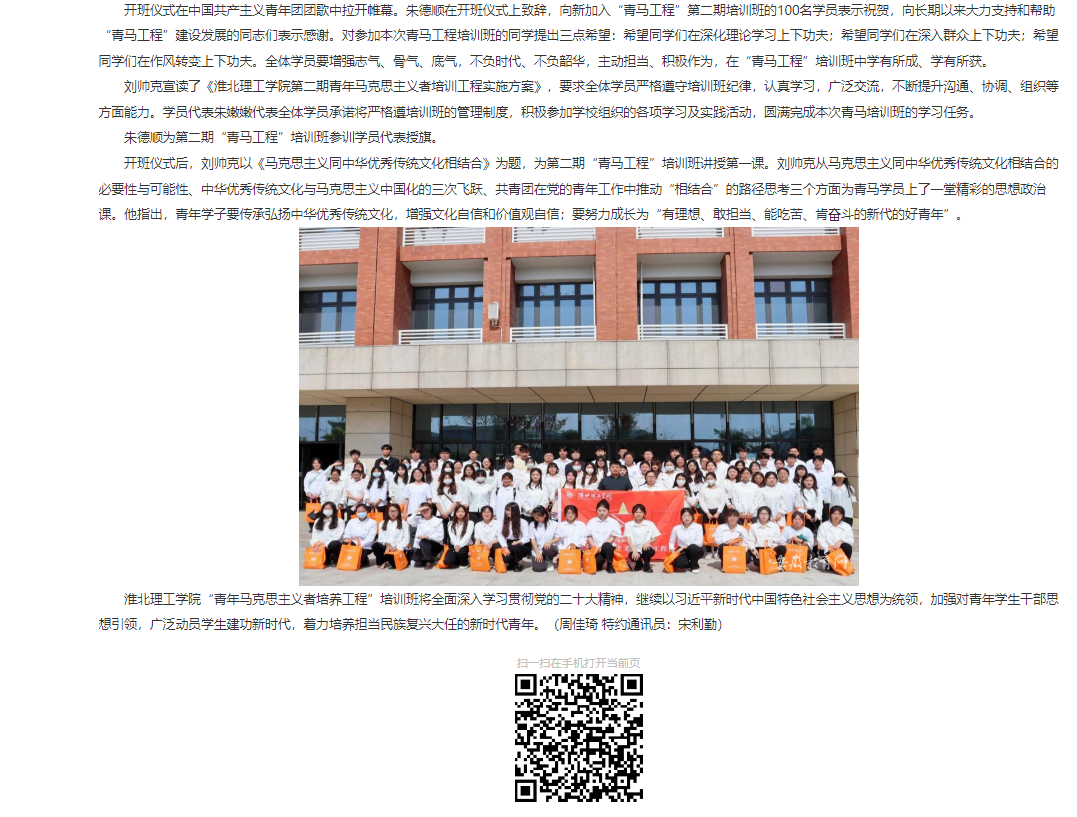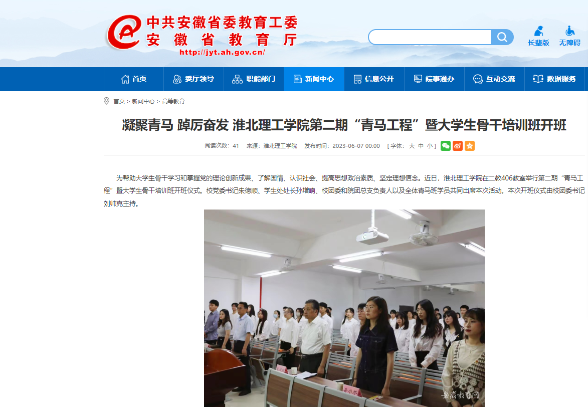 为帮助大学生骨干学习和掌握党的理论创新成果、了解国情、认识社会、提高思想政治素质、坚定理想信念。近日,淮北理工学院在二教406教室举行第二期“青马工程”暨大学生骨干培训班开班仪式。对此,安徽教育网作了报道: