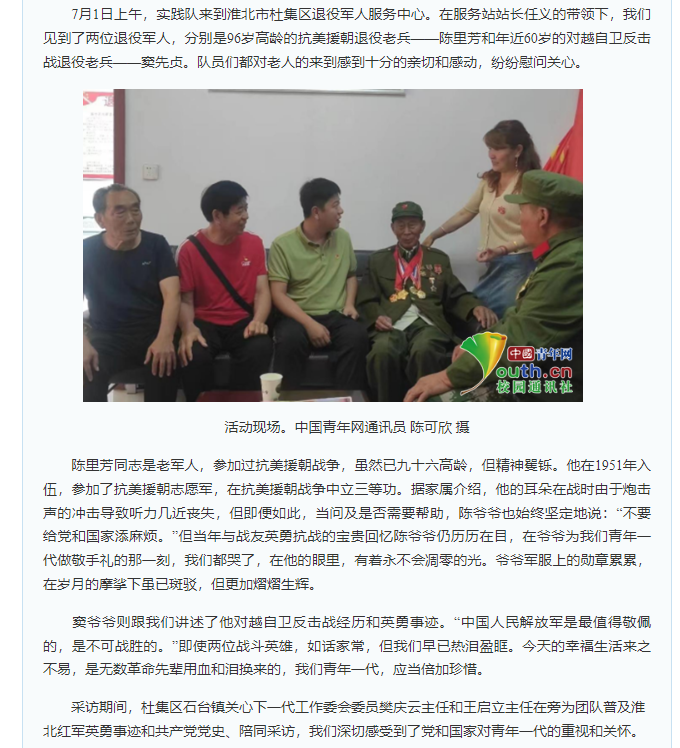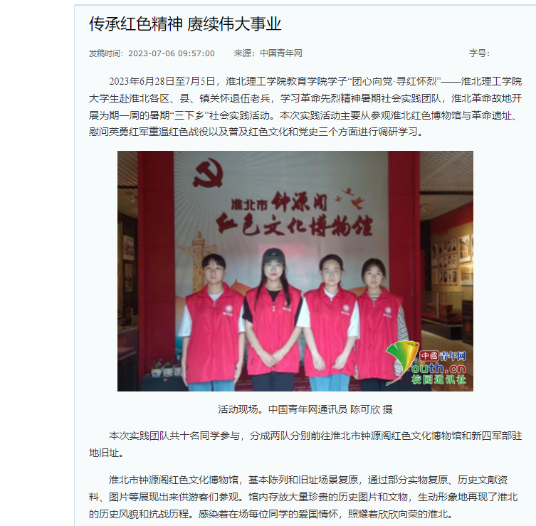 2023年6月28日至7月5日,淮北理工学院教育学院学子“团心向党·寻红怀烈”——淮北理工学院大学生赴淮北各区、县、镇关怀退伍老兵,学习革命先烈精神暑期社会实践团队,淮北革命故地开展为期一周的暑期“三下乡”社会实践活动。本次实践活动主要从参观淮北红色博物馆与革命遗址、慰问英勇红军重温红色战役以及普及红色文化和党史三个方面进行调研学习。对此,中青网作了报道: