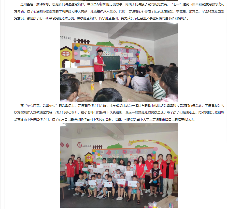 为进一步深入学习党史学习教育,引导未成年人了解党史知识,深植爱国主义思想,丰富暑期生活,朔里镇段庄村家门口党群服务站与淮北理工学院携手组织开展“童心向党”暑期实践活动。2023年7月1日,淮北理工学院大学生到段庄村开展暑期实践活动。实践活动以拓展红色知识和党建知识为主题,开展了书法课、舞蹈课、朗诵课、绘画课等多项兴趣课程。对此,杜集区人民政府网站进行了报道: