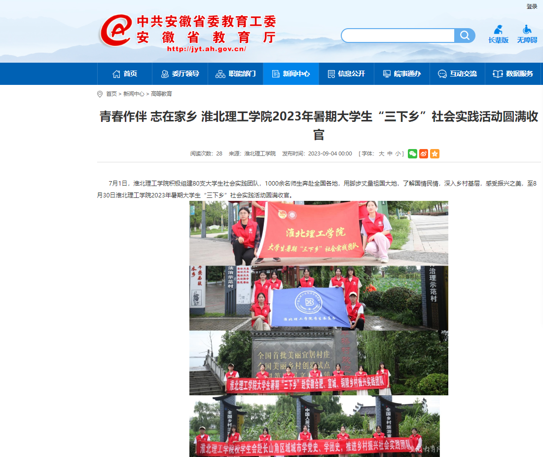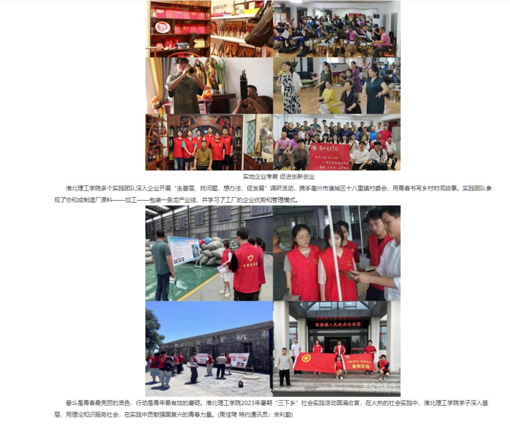 7月1日,淮北理工学院积极组建80支大学生社会实践团队,1000余名师生奔赴全国各地,用脚步丈量祖国大地,了解国情民情,深入乡村基层,感受振兴之美,至8月30日淮北理工学院2023年暑期大学生“三下乡”社会实践活动圆满收官。安徽教育网对此作了报道:http://jyt.ah.gov.cn/xwzx/gdjy/40669021.html
