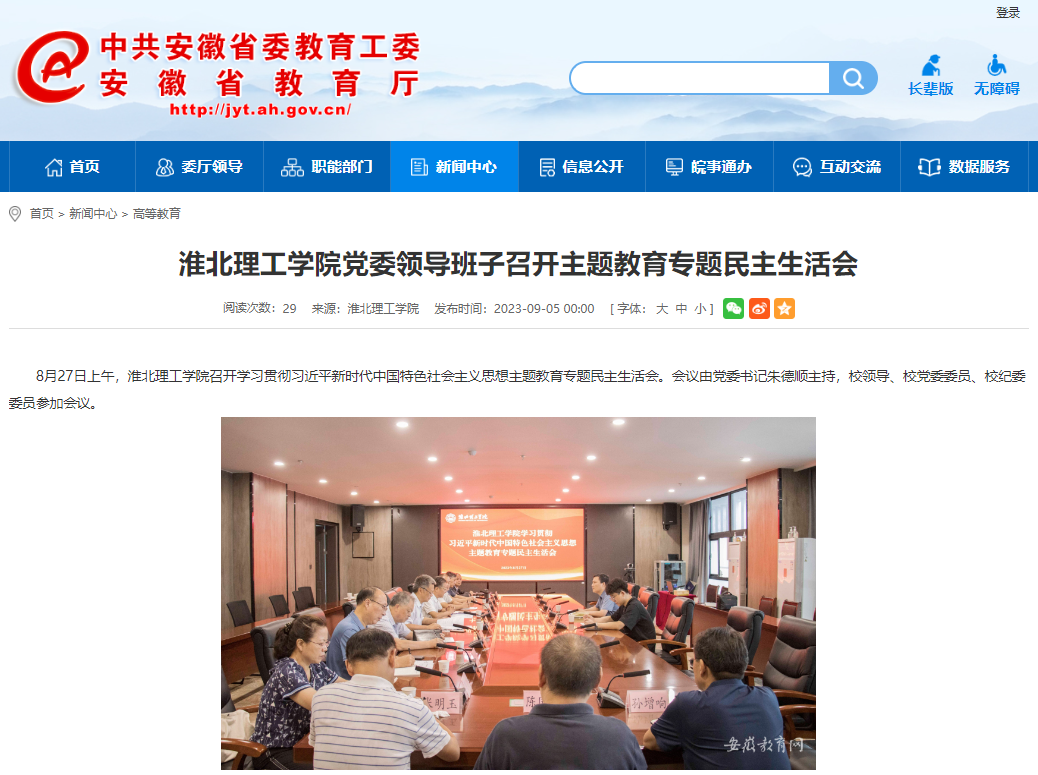 8月27日上午,淮北理工学院召开学习贯彻习近平新时代中国特色社会主义思想主题教育专题民主生活会。会议由党委书记朱德顺主持,校领导、校党委委员、校纪委委员参加会议。安徽教育网对此作了报道: