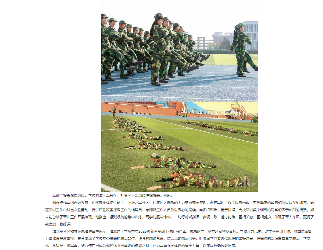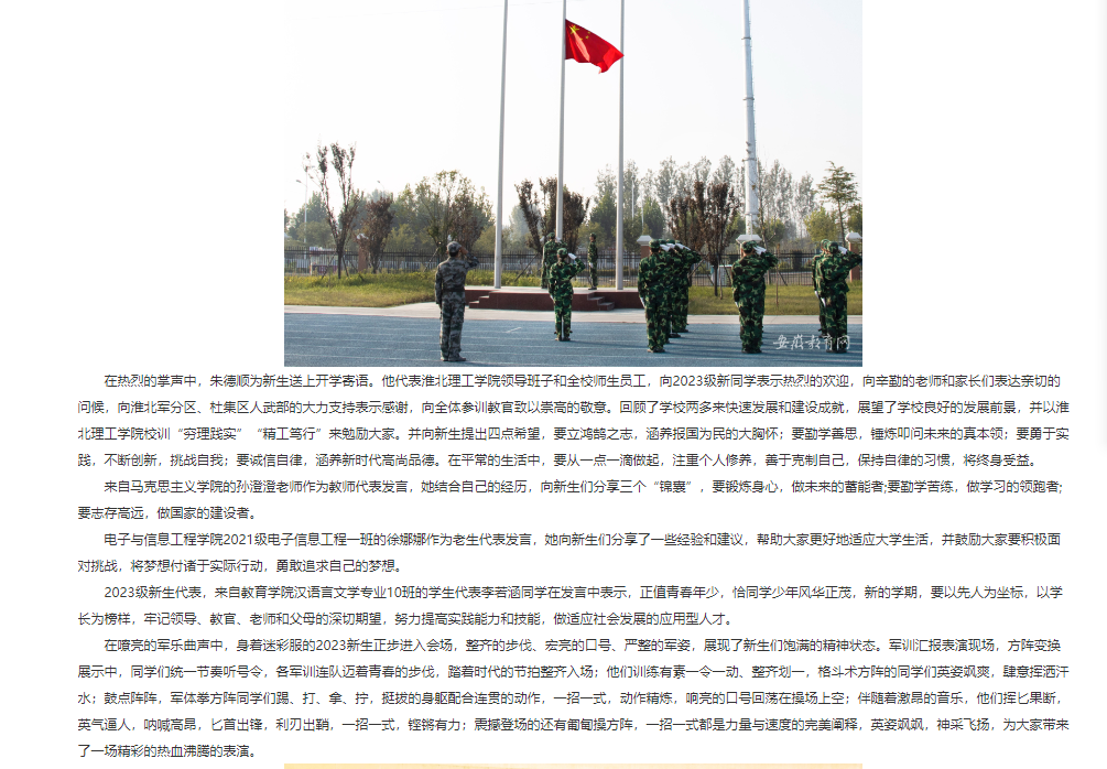 10月22日上午8点,淮北理工学院2023级新生开学典礼暨军训总结大会在田径运动场上隆重举行。在国旗护卫队的庄严护卫下,鲜艳的五星红旗冉冉升起,2023级全体新生身着戎装,军容整齐,以昂扬的精神面貌在田径运动场依次列队,准备接受主席台检阅,汇报训练成果。对此,安徽教育网进行了报道: