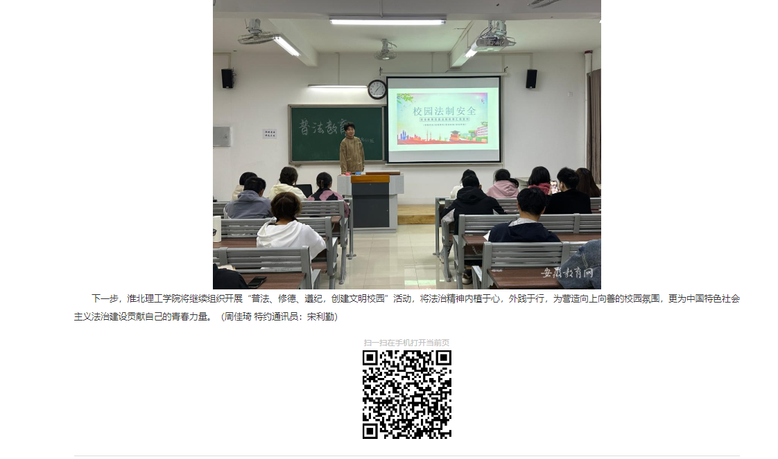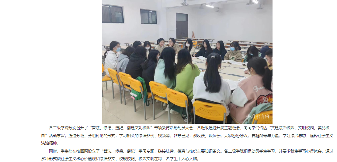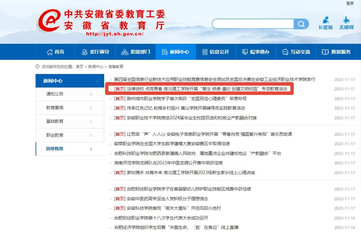 为全面贯彻党的教育方针,落实立德树人根本任务,创建学风校风优良的文明校园,近期,淮北理工学院开展“普法 修德 遵纪 创建文明校园”专项教育活动。各二级学院积极行动,根据文件精神积极组织开展各项专题活动。对此,安徽教育网首页进行了报道: