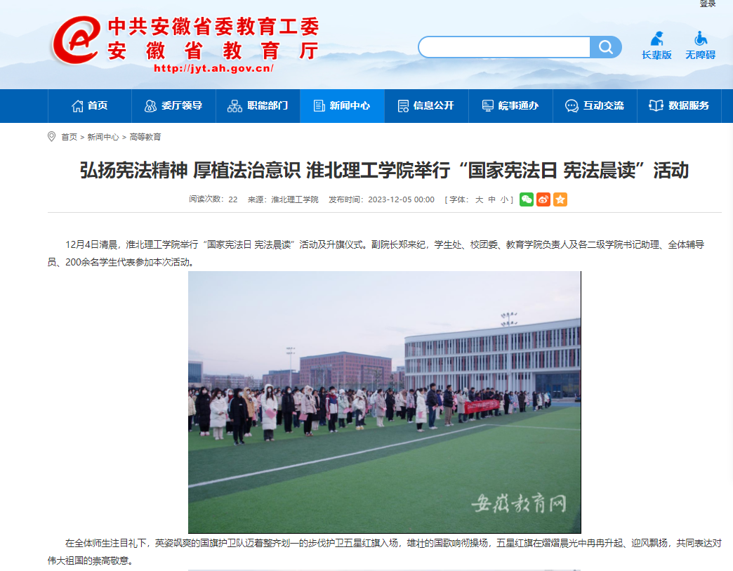 12月4日清晨,淮北理工学院举行“国家宪法日 宪法晨读”活动及升旗仪式。副院长郑来纪,学生处、校团委、教育学院负责人及各二级学院书记助理、全体辅导员、200余名学生代表参加本次活动。对此,安徽教育网进行了报道: