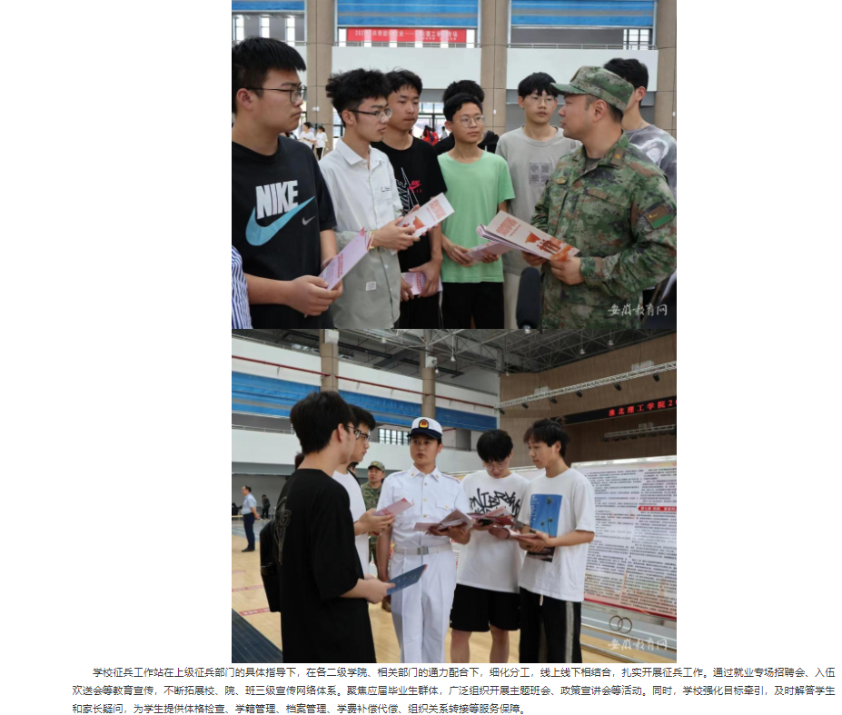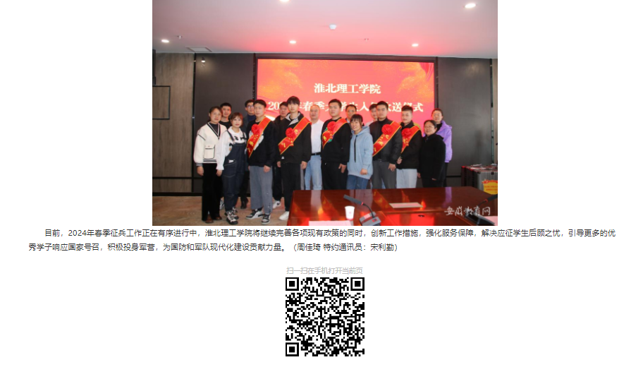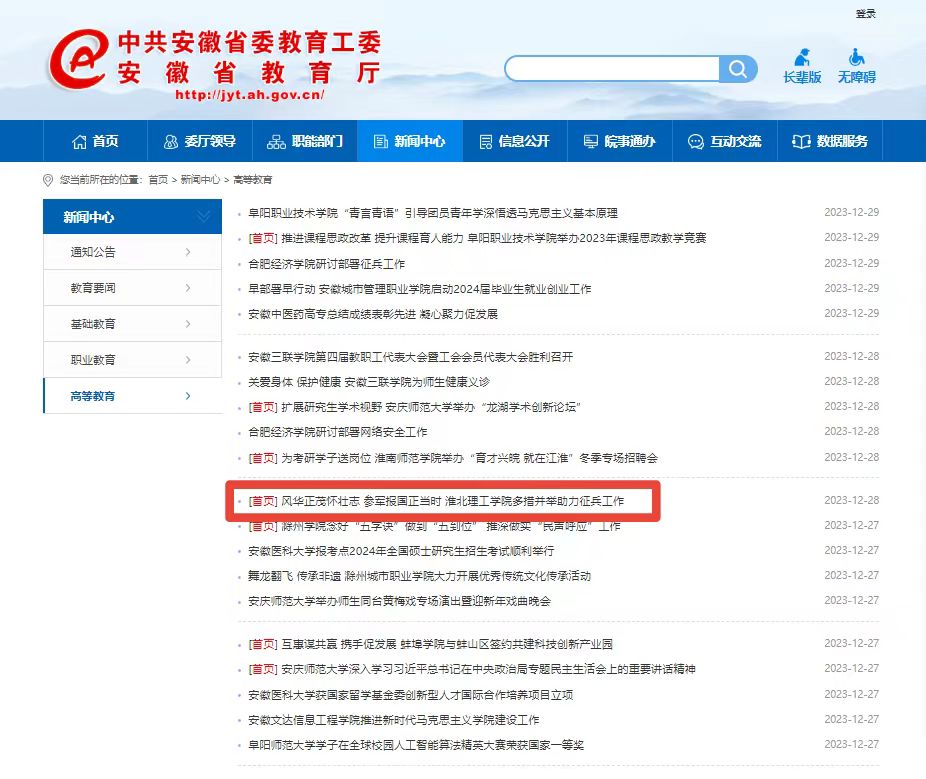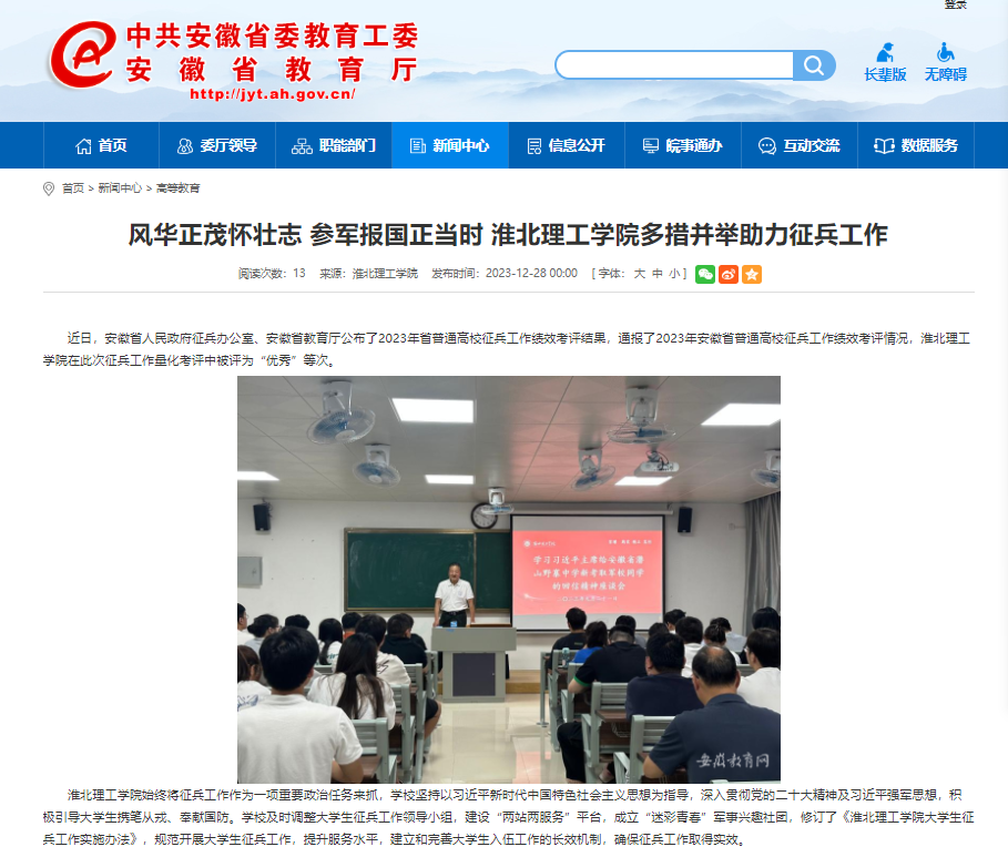 近日,安徽省人民政府征兵办公室、安徽省教育厅公布了2023年省普通高校征兵工作绩效考评结果,通报了2023年安徽省普通高校征兵工作绩效考评情况,淮北理工学院在此次征兵工作量化考评中被评为“优秀”等次。对此,安徽教育网进行了报道: