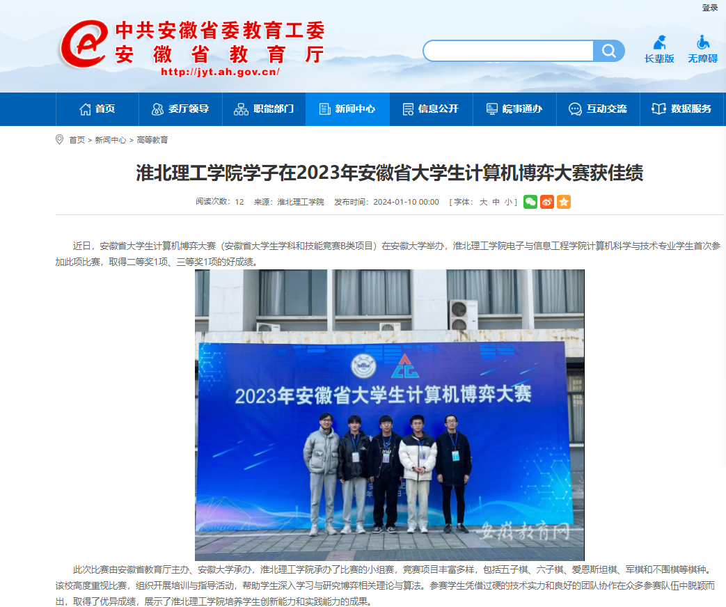 近日,安徽省大学生计算机博弈大赛(安徽省大学生学科和技能竞赛B类项目)在安徽大学举办,淮北理工学院电子与信息工程学院计算机科学与技术专业学生首次参加此项比赛,取得二等奖1项、三等奖1项的好成绩。对此,安徽教育网进行报道: