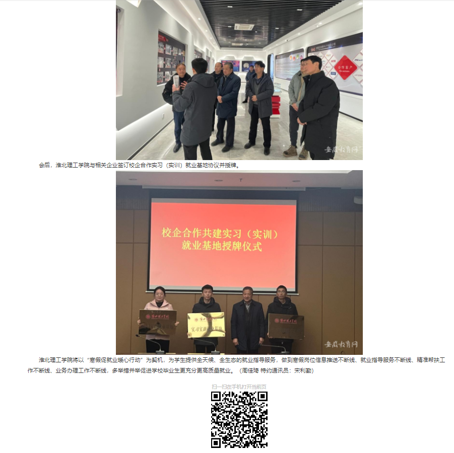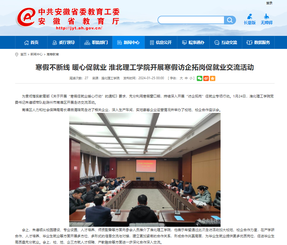 为贯彻落实教育部《关于开展“寒假促就业暖心行动”的通知》要求,充分利用寒假窗口期,持续深入开展“访企拓岗”促就业专项行动。1月24日,淮北理工学院党委书记朱德顺带队赴滁州市南谯区开展走访交流活动。对此,安徽教育网进行了报道: