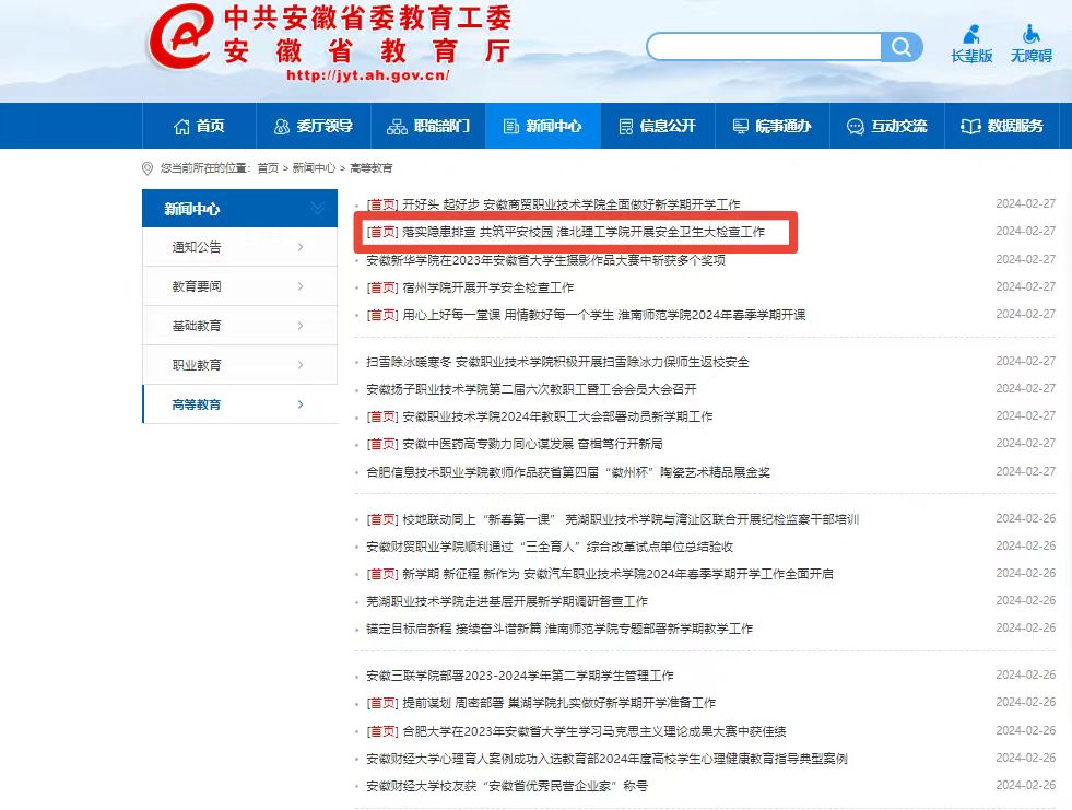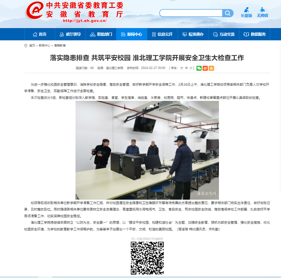 为进一步强化校园安全管理意识,消除学校安全隐患,落实安全管理,做好新学期开学安全保障工作,2月26日上午,淮北理工学院校领导率相关部门负责人对学校开学准备、安全卫生、后勤保障工作进行全面检查。对此,安徽教育网进行了报道: