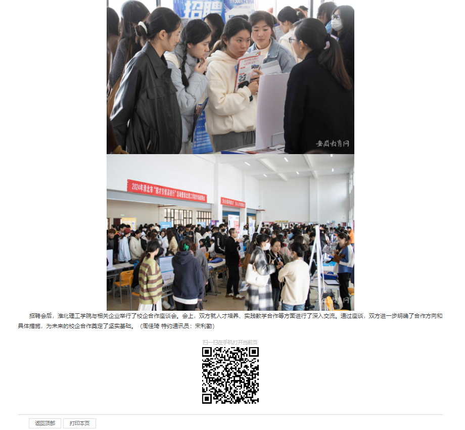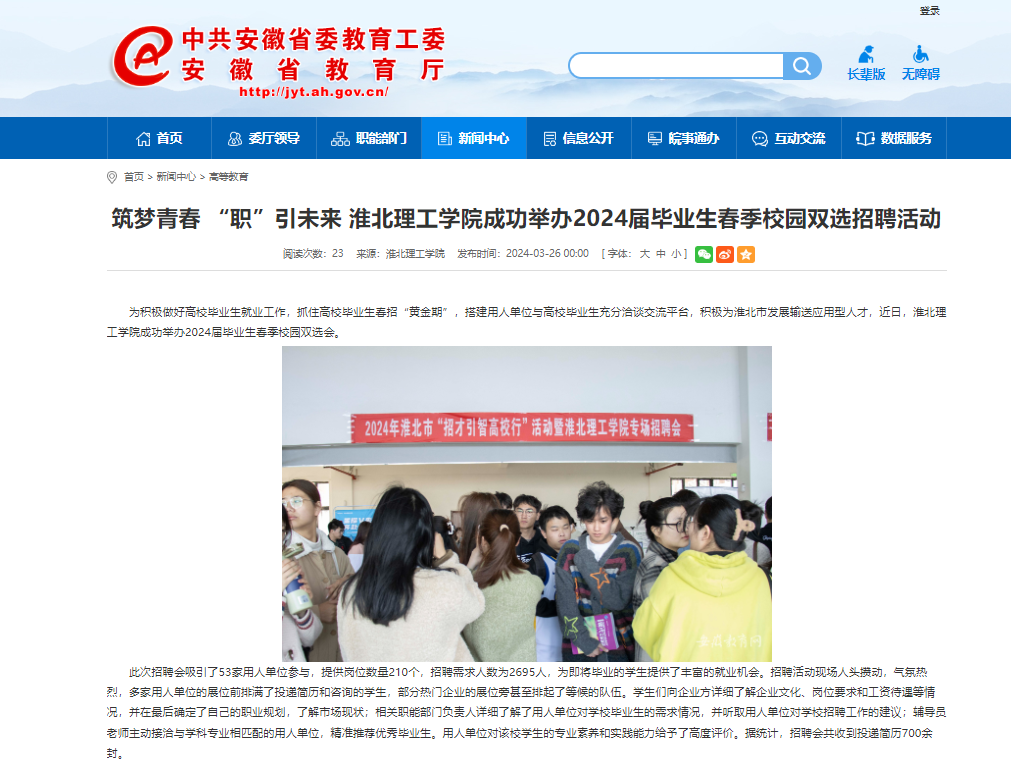 为积极做好高校毕业生就业工作,抓住高校毕业生春招“黄金期”,搭建用人单位与高校毕业生充分洽谈交流平台,积极为淮北市发展输送应用型人才,近日,淮北理工学院成功举办2024届毕业生春季校园双选会。对此,安徽教育网进行了报道: