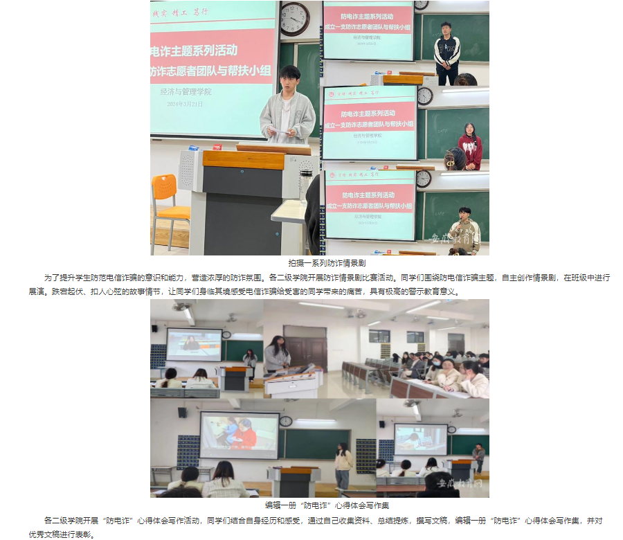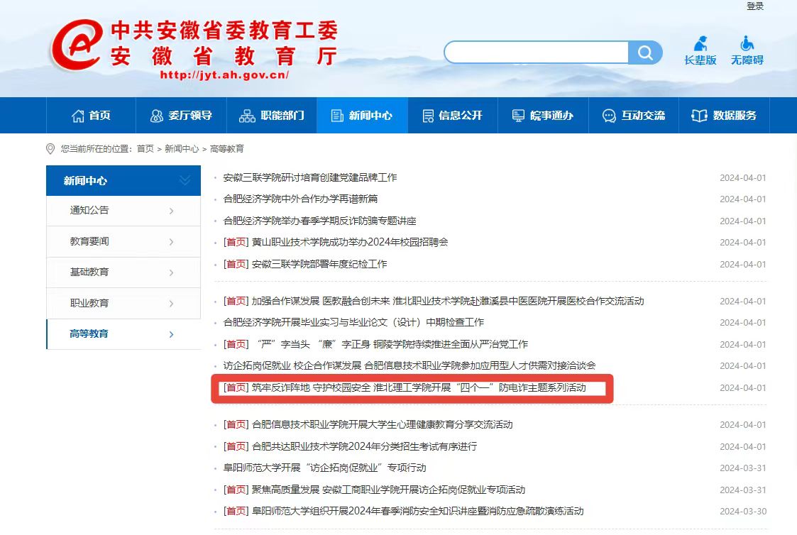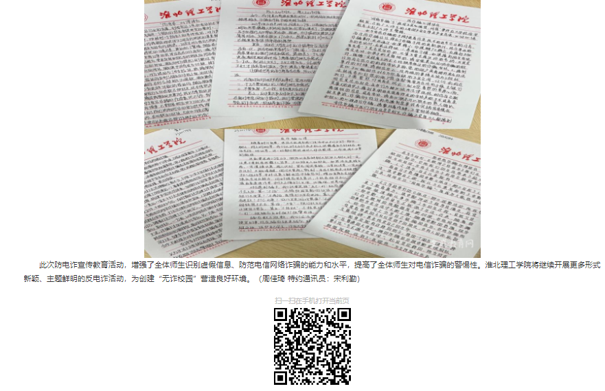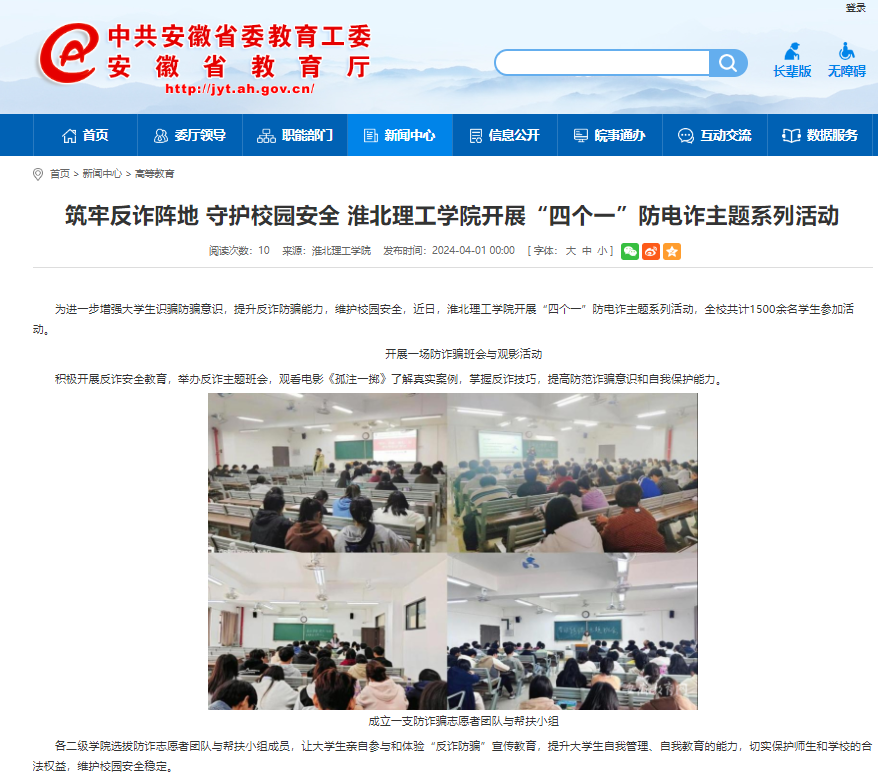 为进一步增强大学生识骗防骗意识,提升反诈防骗能力,维护校园安全,近日,淮北理工学院开展“四个一”防电诈主题系列活动,全校共计1500余名学生参加活动。对此,安徽教育网进行了报道: