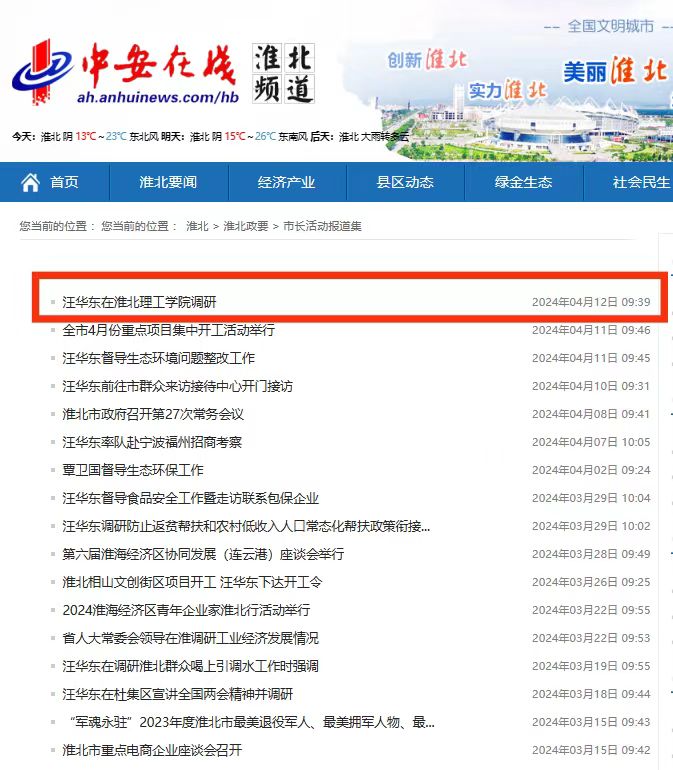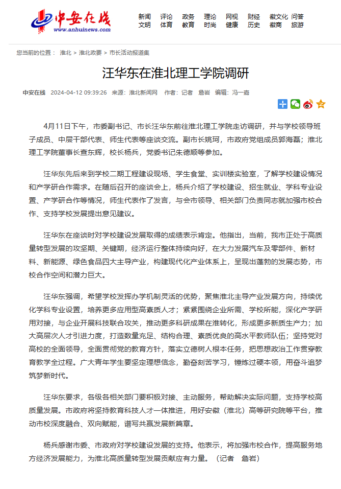 4月11日下午,市委副书记、市长汪华东前往淮北理工学院走访调研,并与学校领导班子成员、中层干部代表、师生代表等座谈交流。中安在线对此进行了报道。
